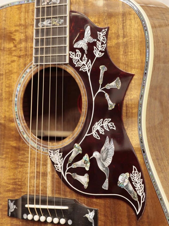 ヘッド、指板、ブリッジ、ピックガードを彩る貝細工は、全部で13羽のハチドリが舞う壮麗なデザイン。