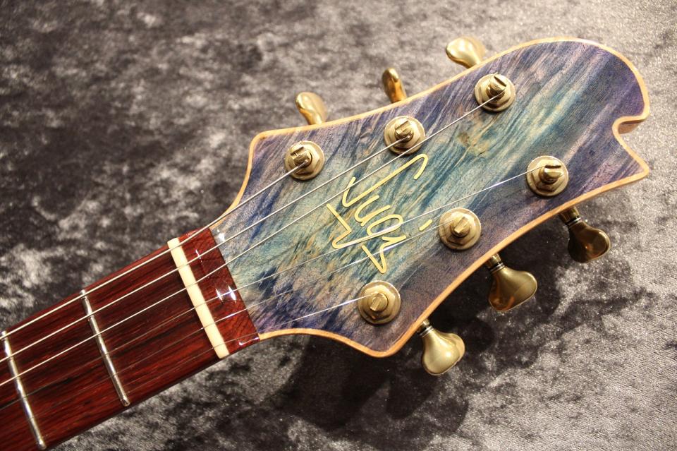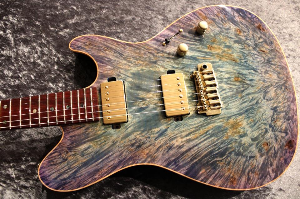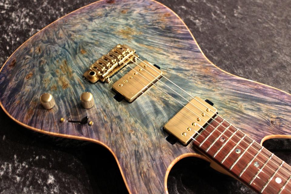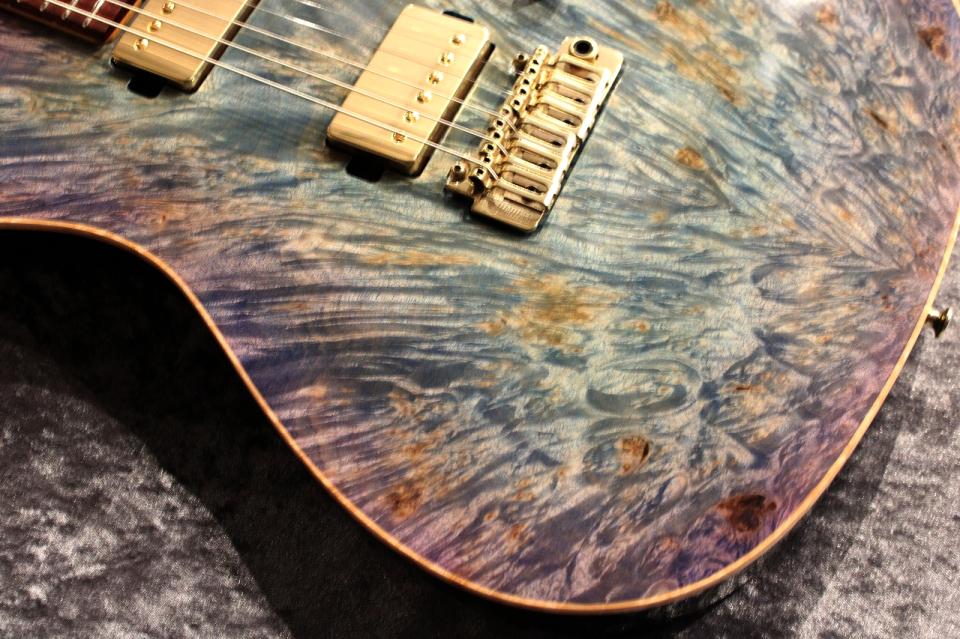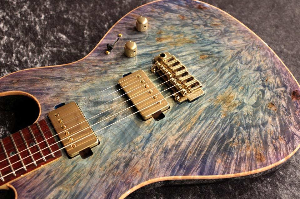 こちらの個体は激しい杢目のバールメイプルに一目惚れをしてしまい、トップ材のイメージからルックス面を固め、サウンド重視でその他木材のセレクトをいたしました。