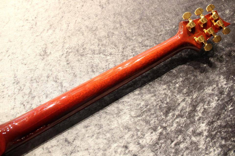 スペックになりますが、シグネイチャー・グレードのフィギュアドシダートップに極上のマホガニーバック(ホロウチェンバード加工)、指板材は先述の通り"ローズウッド"を採用しております。