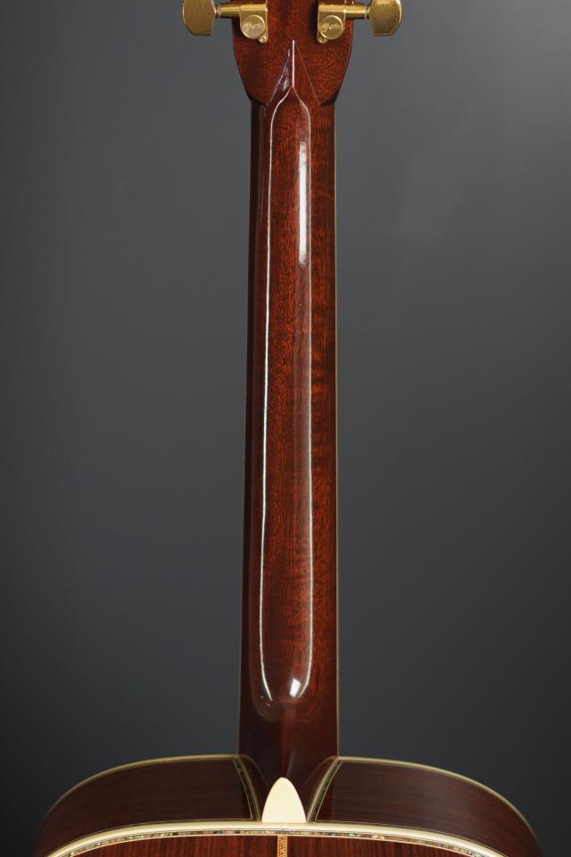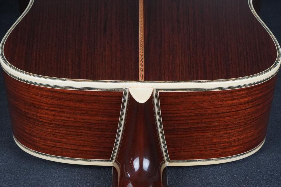 サイド&バックもD-45らしい、とても美しい柾目のイーストインディアンローズウッドが使わており、赤褐色の木肌には所々で黒い筋が通る、古い時期の木材のような風合いを持った良材で、そこに45スタイルらしい細かくカラフルなセンターストリップやアバロントリムが合わさり、魅惑的な素晴らしいルックスとなっております。