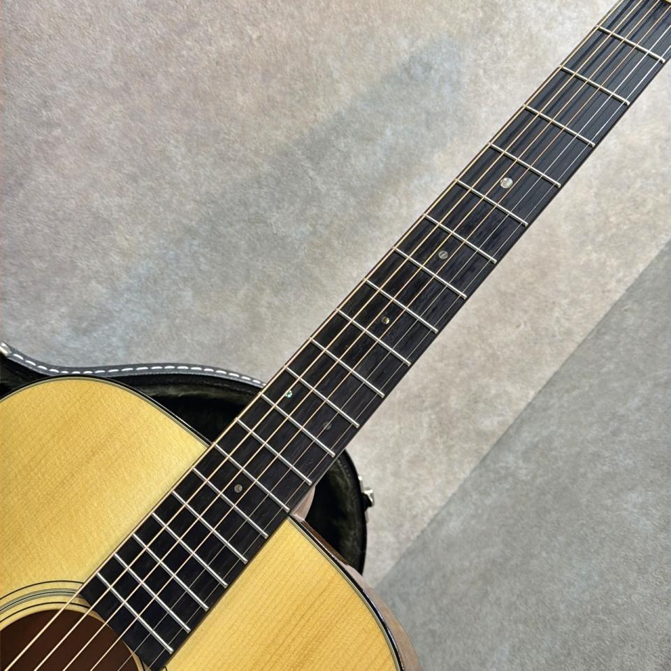 マホガニーらしい温かみのあるブラウンカラーが、000スタイルの軽やかな佇まいと見事に調和しています。