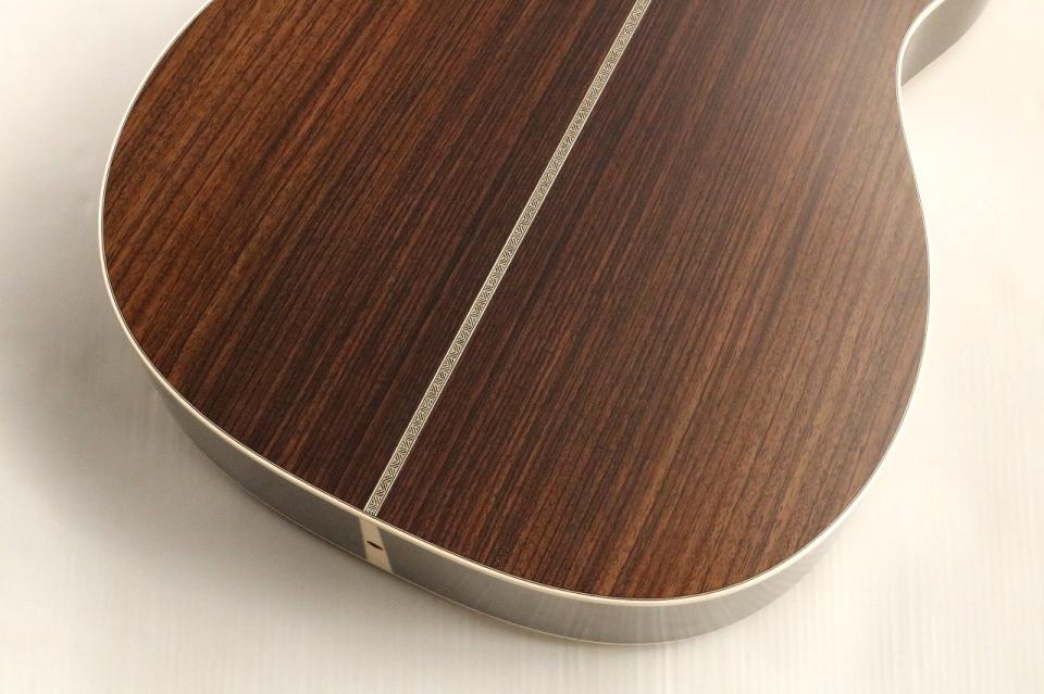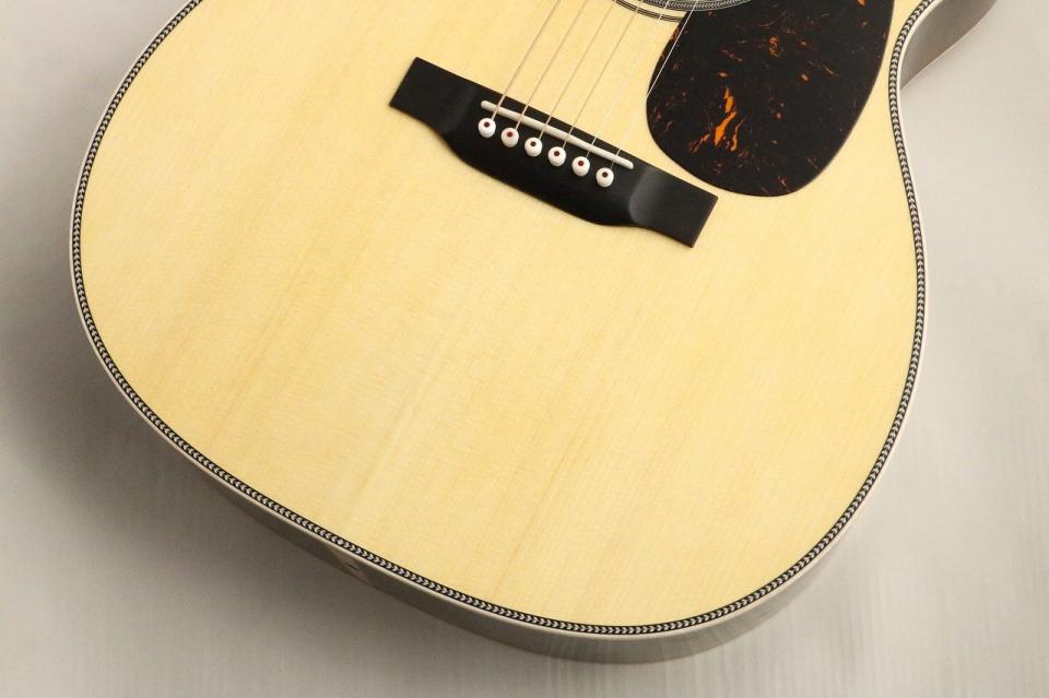 響きは素直な立ち上がりが感じられながらも安定感があり長い残響感を持って響いてくれます。低音の輪郭が鮮明で力強く響く為か000サイズの中でも大きく響いてくれるモデルに仕上がっています。安定した低音に包み込まれるように響き高音域は粒立ち・透明感に優れ、明るく透き通ったような上品な響きが感じられます。さらに中高音域の響きも非常にクリアな為単体で演奏するとすっきりとした印象もありますが、比較してみると音量と透明感に優れた まさに贅をつくした000-28という印象があります。スタンダードシリーズになれている方からすると少々癖のあるネックシェイプですが是非000-28をご検討されていた方に候補に入れて頂きたい一本です。