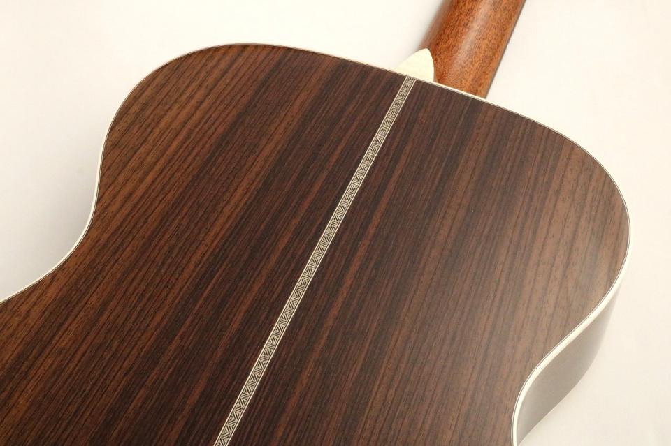 オープンギアのシルバーペグに、幅広44.5mmのナット幅、握ると分かる鋭角なVの形をしたビンテージVシェイプのネック。ヘリンボーンの装飾を採用した目を惹くロゼッタと指板にはお洒落なダイアモンドインレイ、鼈甲柄ピックガードに、トップには色味が入ったエイジングトナー。以上が現在では一部スタンダードにも取り入れられた往年の人気モデル000-28ECの特徴です。000-28ECはエリッククラプトンが好む仕様を集め1996年に発売されて以降現在にいたるまで根強い人気を誇る素晴らしいモデルです。000-28ECも素晴らしいモデルですが、今回ご紹介する一本は多くのアコースティックギターファンが想像する『こんなMartin ギターがあったら』を叶えるMartin Custom Shop製。トップのシトカスプルースはD-45と同様のグレードのプレミアムグレードの材を使用。サイド・バックのローズウッドもそれに併せてMartinファクトリーにて選定をしてもらっています。全体的に杢のまっすぐ入った非常にきれいなローズウッドサイドバック。バック板は若干色味の明るい印象がございますが、サイド同様真っ直ぐな木目のきれいなローズウッドが使用されています。バインディングには美しいメイプル材を使用、ネックシェイプはVビンテージVシェイプながらスタンダード同様のサテンフィニッシュになってサラサラとした手触り。もちろんの事Eric Craptonのシグネイチャーは使用できませんので指板のシグネイチャーインレイは無し。反面000-28ECスペックは所有したいけれどもエリッククラプトンだけのファンじゃない!という方へもオススメできる外観になっています。