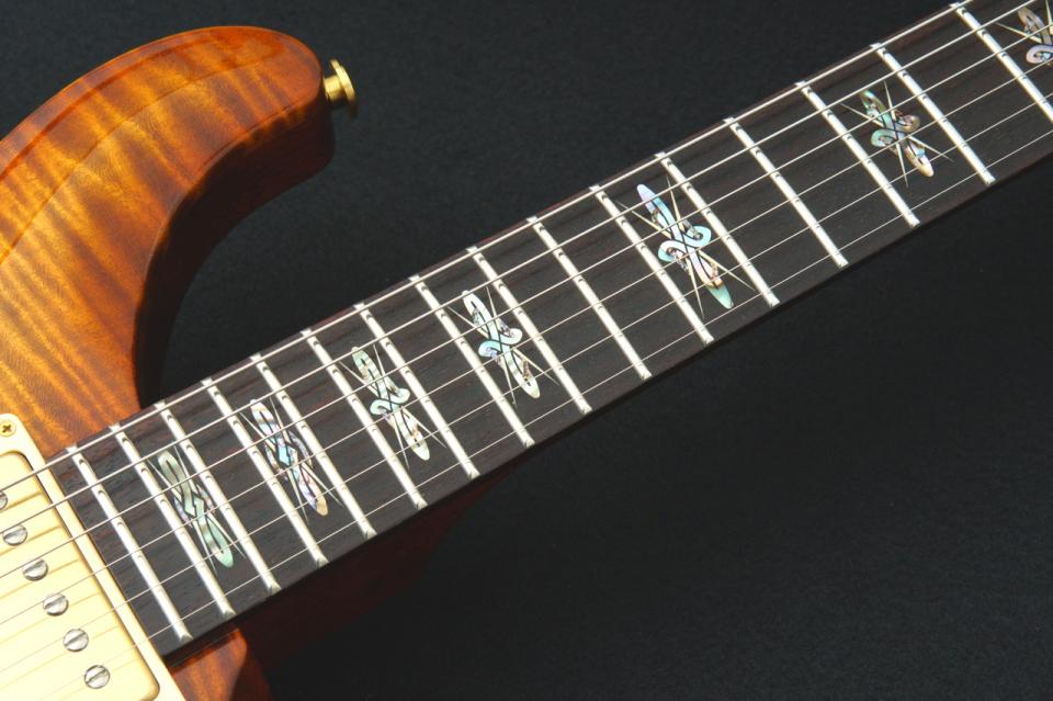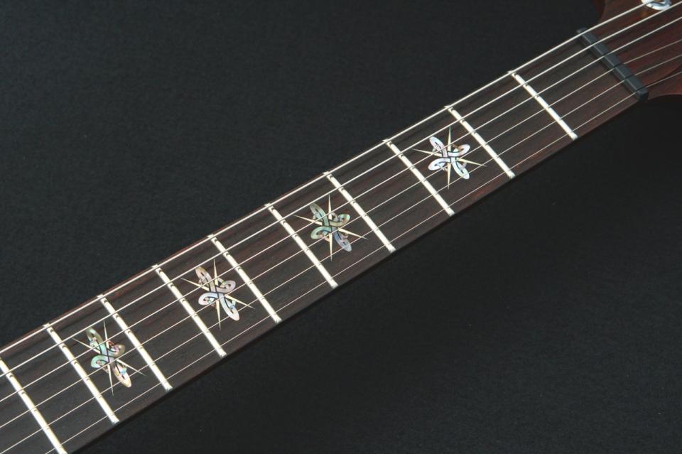 さらに、ヘッドストックカバーにはダーク・メキシカンローズウッドを使用し、アバロンやパウア、マンモスアイボリーによるケルティッククロス・インレイが施されています。