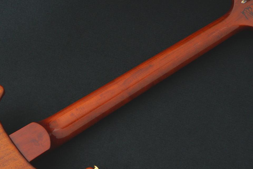 ネックには、これまでギターには用いられることのなかった稀少材ペルナンブーコを採用。指板にはイーストインディアン・ローズウッド、トップには美麗なタイガー・カーリーメイプル、バックにはアフリカン・マホガニーを使用し、いずれも長年かけて選び抜かれた最高峰の木材です。