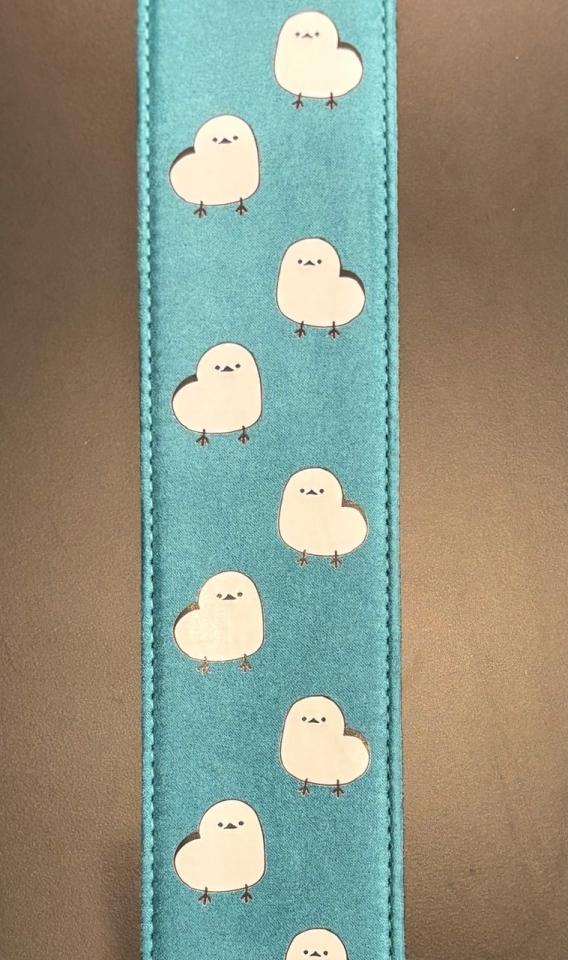 ふんわりとした布素材に手描きイラストのシマエナガを左右交互にあしらった、まるで小鳥が散歩しているかのような愛らしいデザインのギターストラップです。