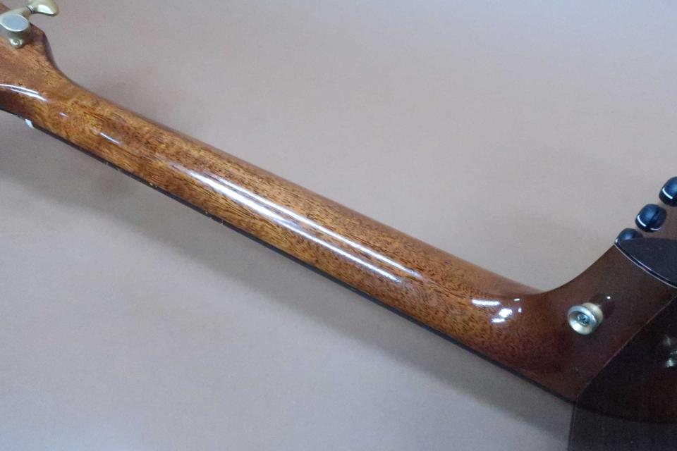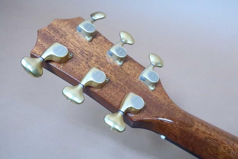 状態は使用感も少なくトップやサイド、バックも素晴らしく綺麗なコンディションを保っております。ただネックヒールのジョイント箇所に僅かに塗装の浮きが見られますが強度やサウンドに影響する物では有りません。またヘッドのロゴ辺りに塗装のチェッキングが見られますが見る角度で消えます。その他はフレットの減りもローフレットで8分目は残っており、ネック裏も綺麗で演奏性も問題は有りません。ピックアップシステムも問題が無く作動し、気になる電池ボックスも新しいタイプに交換ずみで専用電池も一般のアルカリ9V電池もご使用が可能です。弦長約647.7mm、ナット幅約43mm、弦高は12F6弦約2.3mm、1弦約1.8mm、サドルの余裕も3~4mm有りネックの元起や反りも見受けられず、トラスロッドの締め余裕もありネックを含めプレヤビリティも良好です。オリジナルハードケース、ご購入当時の保証書、取説など揃っております。高級感溢れるルックスに高級材アディロンダックスプルースを使用したカスタム・オーダオのコレクタブルな1点物、ネックヒールの僅かな塗装浮き有りのセール特価品です。是非この機会にご検討を頂ければ幸いです。