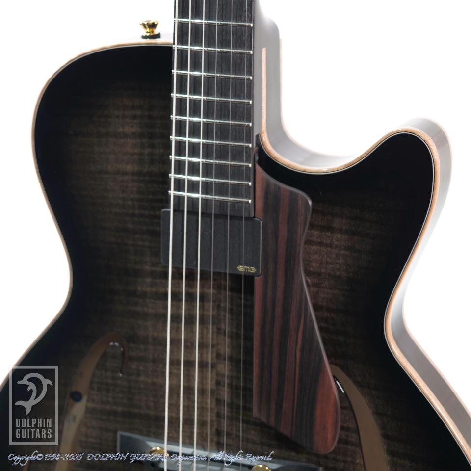 モダンなSシェイプのサウンドホールや、フレイムメイプルの美しい杢目が洗練された現代的なシルエットを印象付けております。
