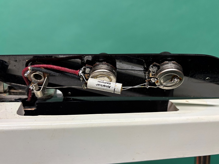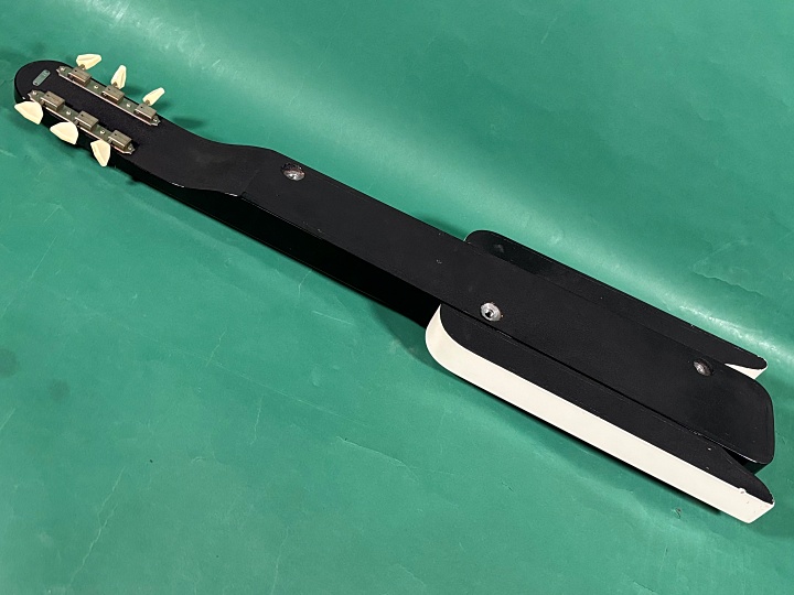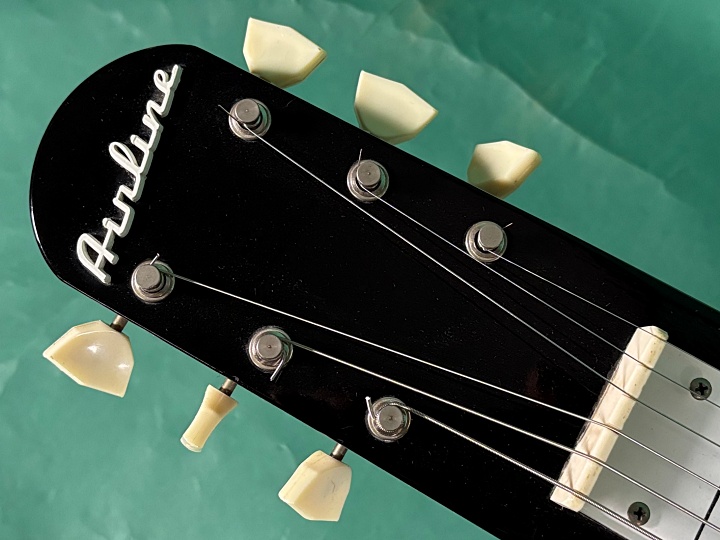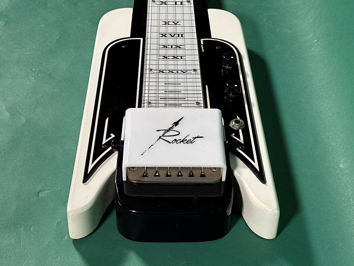 Airline Rocket 1961年製入荷。その名の通りロケット・シェイプのボディにブラック&ホワイトのコンビネーションカラ-が目を惹く1本!オリジナルレッグ付き仕様のモデルになります。こちらはAIRLINEの他にNATIONAL、SUPROなど数多くのブランドの楽器をOEMで生産していたVALCOメイドの1本になります。オリジナルピックアップ搭載、シリアルは1961年、ポットデイトはVOL1961年・TONE1961年製。全体的にスレや打ちキズ、ヘッドに弦スレ、ポツキズ。ボディ・エッジに打ちキズ、指板周りやエンド側に打ちキズがポツポツと。