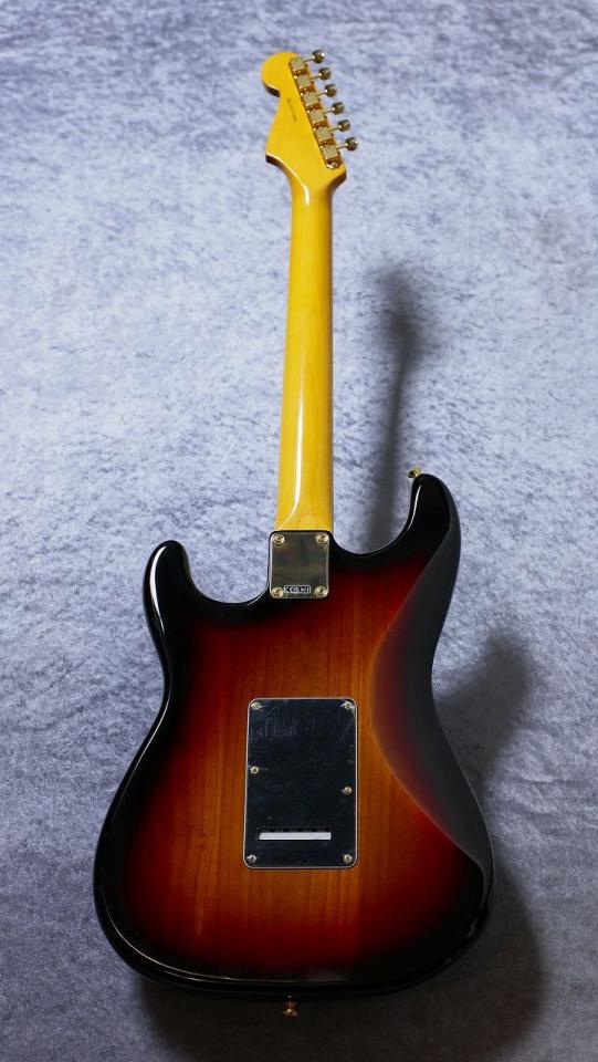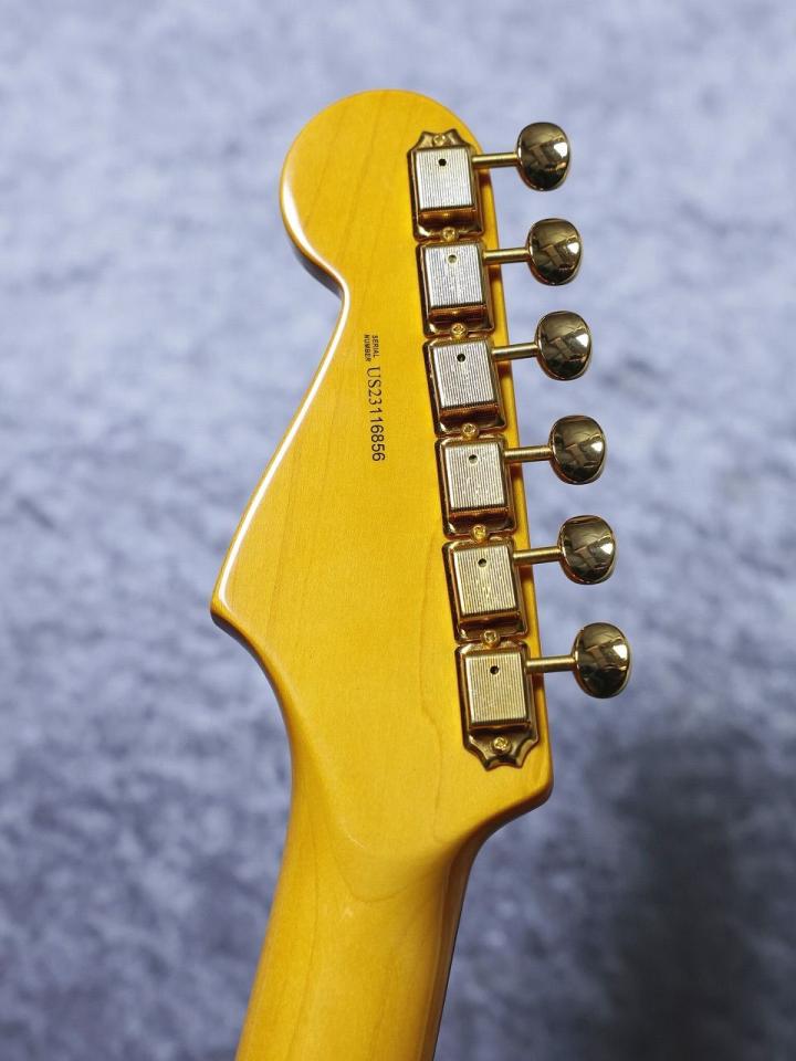ピックガードはイニシャルの刻印入りで、ゴールドのハードウェアと左用のトレモロユニットを搭載している点も特徴的です。