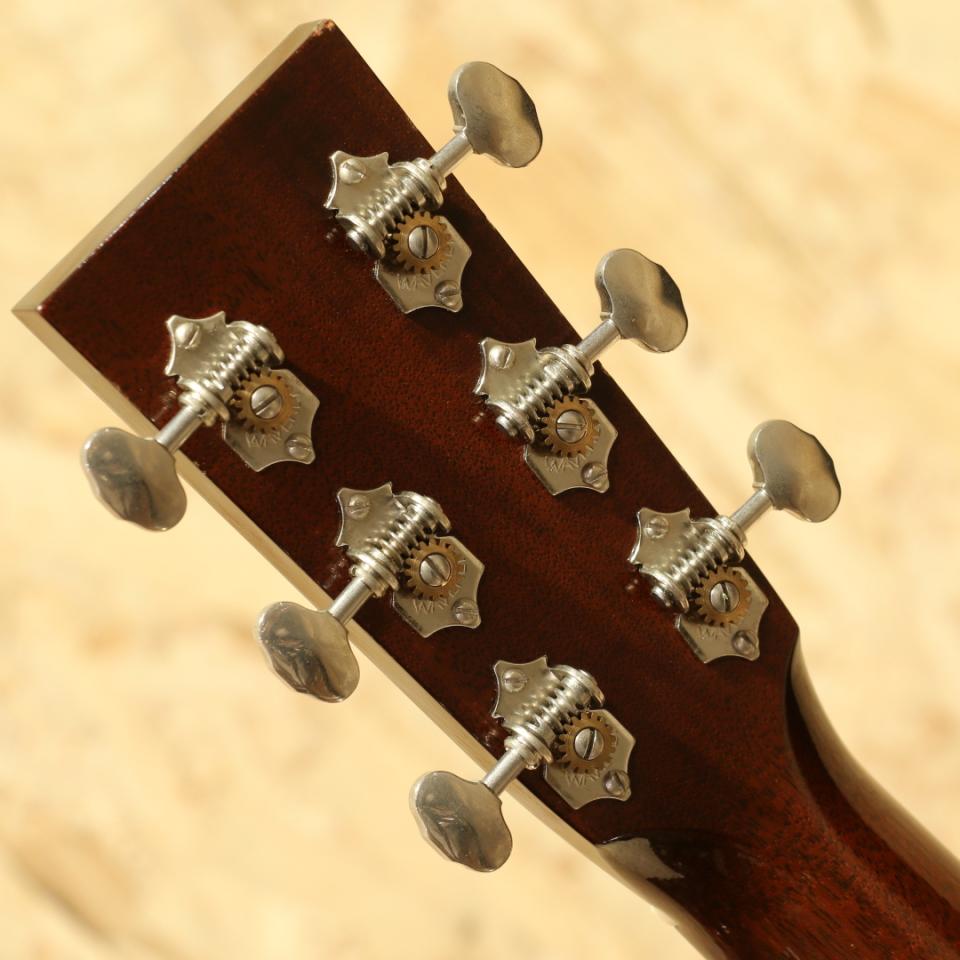 戦前トラディショナルスタイルを軸に独自のアイデンティティを確立した世界的にもっとも高い評価を得ているブランドの一つであるコリングスギター。他を凌駕したその完成度の高さ故、評価は同業製作家や一級のプロアーティスト、プレイヤーなど目が高い層に特に一目置かれた存在です。プレイヤーの憧れのブランドと言えます。本器は定番のD18スタイル、材のオプションを加えたカスタム品、2004年製のUSED品。トップに厳選されたアディロンダックスプルース、マホガニーサイド&バック、マホガニーネック、エボニー指板&ブリッジ、ウェバリー4060チューナー、ドット指板インレイ、べっ甲柄ピックガード、ベッコウセルバインディング、トップ構造はコリングス風のアレンジが加えられたアドバンスド・スキャロップド・エックスブレイシング、後付けにてL.R Baggs Dual Sourceを搭載。通常のドレッドノートは深みのサウンドが持ち味ですが、コリングスはそこに明瞭な響きとピッチ感、ボリューム感を足すようなアレンジを施して製作。音の輪郭はタイトにクリアに、ですが余韻はオープンに。音が混じり合って濁るようなことはなく非常に分離感の良い響き。レンジ感も広い為マホガニーを使用していることを忘れてしまう程のサウンドを響かせます。重苦しさが無く乾いた響き、カラッとした明るさはマホガニー由来でしょう。何よりもそのタイトな輪郭のおかげで、指板上どこを押さえても音がハッキリと出るというのはコリングスでしか体感し得ない程の特徴。指板上を上下に行き来するジャズやブルーグラスにおいて嬉しいポイントです。音量もあるためブルーグラスミュージシャンからの支持が厚いことにも頷けます。どこをとってもハイレベル、古きを押さえたニュースタンダードと言える1本です。後付けにてL.R Baggs Dual Sourceを搭載。Anthemの前身とも言えるアンダーサドルピエゾ+マイクのシステム。惜しくも現在は廃盤となっています。ボディ内に仕込む基板でモノラルアウトとステレオアウトの変更、位相を合わせるフェイズスイッチ、マイクのローカット周波数の調整などが可能です。これらの機能からマイク感を強く出すセッティングもでき、ステレオアウトで個別にEQを掛けることも出来ます。サウンドホール横のコントローラーはMaster VolとMic Volでシンプル。自由度の高いセッティングが可能、非常に優秀なシステムです。サウンドホール周りに弾きキズ、ボディトップ面ボトム箇所にはウェザーチェック、ピックガードの細かな弾きキズ、ボディトップ6弦側下部の薄い当てキズ等の使用感は見られますが、20年ほどの年月を経たことを考えるとキレイな状態をキープ。ネック周りの演奏性も整えられており、弦高調整の幅も残された状態。コリングスクオリティを存分に体感できる1本です。大胆なストロークプレイからフラットピックでのローからハイのブルーグラスやJAZZスタイルの取り回し、繊細な表現を求められるシビアなフィンガリングでの奏法まで余裕で対応できる優れたドレッドノートです。是非ご体感下さいませ。
