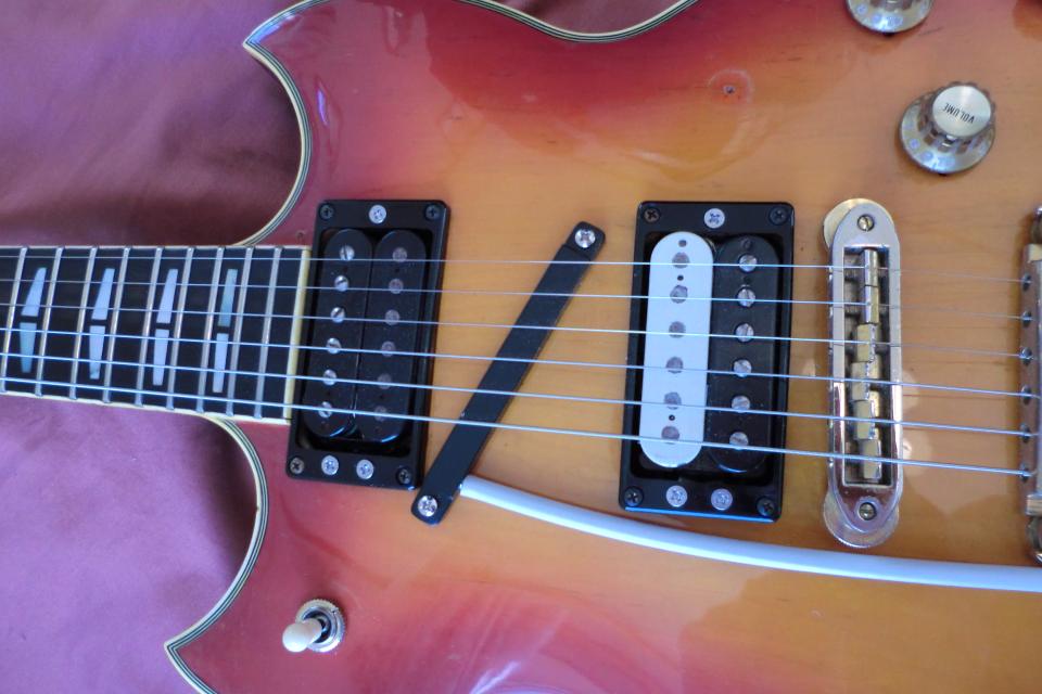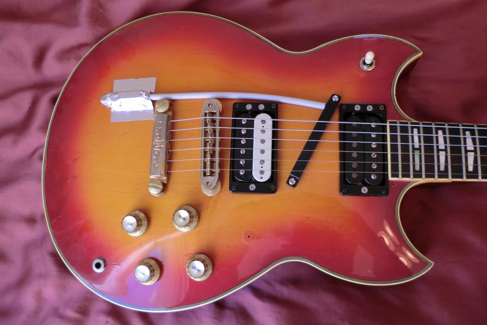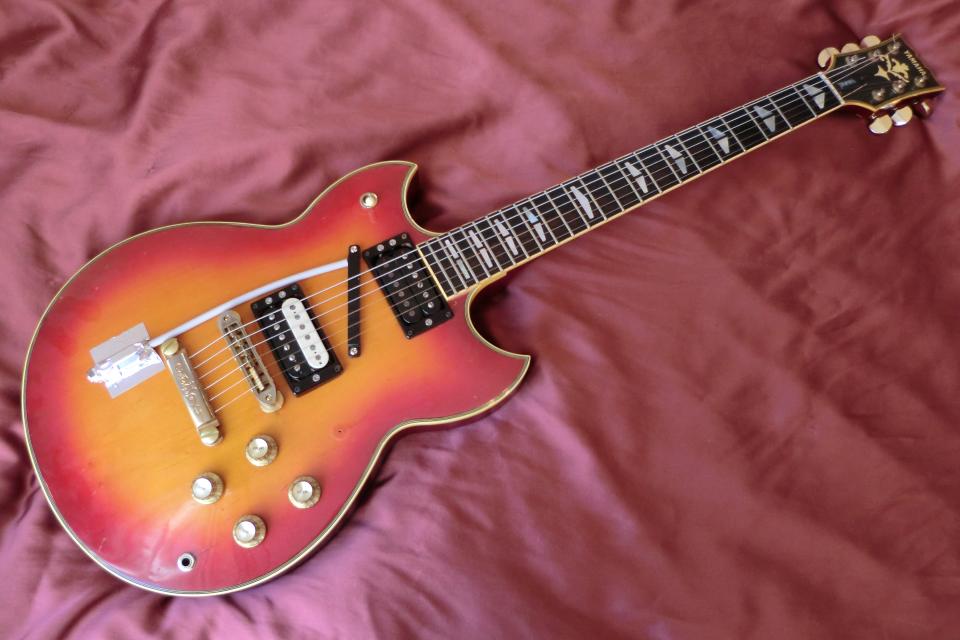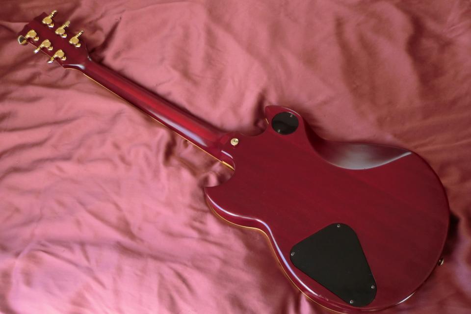 1983年製のYAMAHA SG-1000になります。状態は、ネックはほぼ真っ直ぐ、フレットは8分山、電気系も問題なく、弾き易い状態ですが、高中正義氏が80年代使用していたSG-1000のようにいろいろと改造されています。まずピックアップが、両方ともGibson NEW PAFに(タップSWが使えるように4芯に。リア側はコイルの片側白く塗ってます。)、ギターシンセのPUが増設、ネック裏、ボディのサイド&バックがオーバーラッカーされています。音はギブソンよりな感じです。詳細はお問合せ下さい。マニアな高中ファンの方へ。
