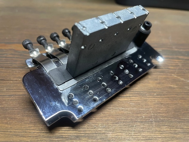 オリジナルのフロイドローズのデザインと機能を維持しながら、スチールの代わりに亜鉛合金のサドルを使用。