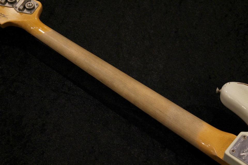 当時のカスタムカラーであるオリンピックホワイトカラーのアルダーボディにはヘヴィレリックを施しており、1961年製を象徴的する2つのスタックノブや、断面のヤケまで細かく再現された3-Plyトータスシェルのピックガードと相まってまさしくビンテージのような風格を醸し出しております。