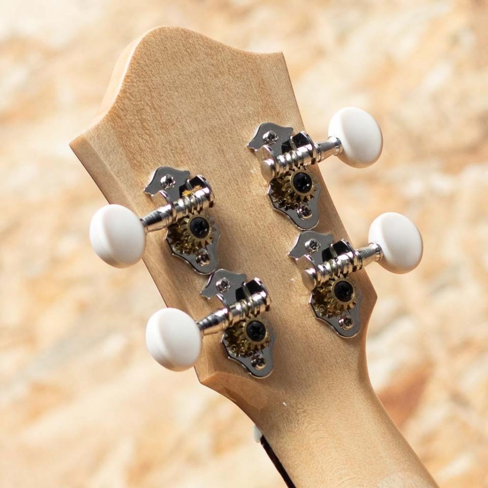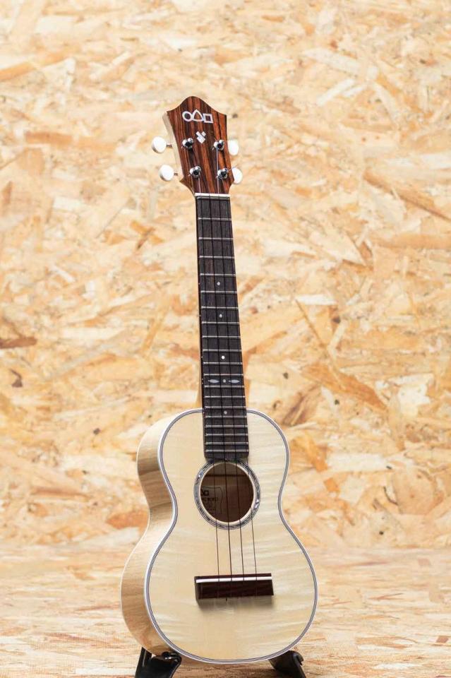 京都市の工房にて占部英明氏、息子の直宏氏によって製作されるハンドメイドウクレレ。本器はきれいな杢のシカモア材を使用したミディアムモデル。ホワイトシカモアボディ、リンデンネック、ウェンジ指板、ローズウッドブリッジ、ホワイトバインディング、アバロンロゼッタ、グローバー製ギヤペグ。表板には特にきれいなカーリー杢が使用されており、見た目も美しい1本です。占部ウクレレ特有のやや薄めで握り易いネックシェイプ、0フレット仕様でローポジションの弾き易さは格別。近頃人気の高いシカモアモデルです。