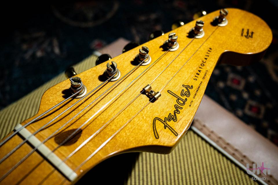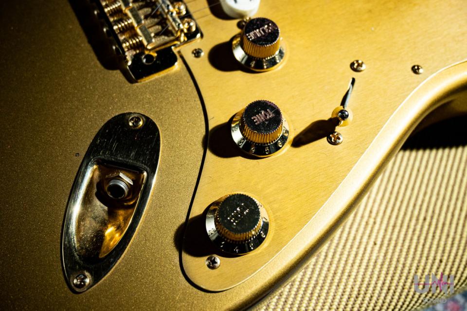 見ての通り金ピカのインパクト抜群のルックスですが、基本は1957年仕様のストラトです。