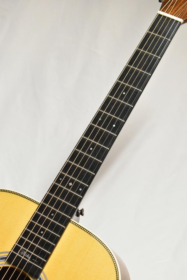 ネックはナット幅は42.9mm、スケールは645.2mm、OMサイズならではのボディの抱えやすさとレギュラースケールによる鳴りの力強さが合いまった楽器としてのバランスの良さが際立っており、シンガーソングライターによる弾き語りでもフィンガースタイルでのソロギターでもなんでもこなしていける魅力があります。