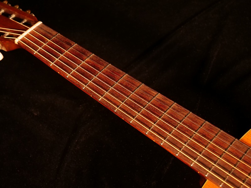 小振りな「0(シングル・オー)」サイズのボディはスプルーストップ、マホガニーサイドバック、ローズウッド指板/ブリッジ、約632mmのミディアムスケール、SQロッド、ノンスキャロップドXブレーシング、スロテッドヘッド・12フレットジョイント仕様のニューヨーカースタイル。約47.5mmナット幅、ネック形状は適度な厚さのかまぼこ型でフィンガープレイ向きのネックグリップです。