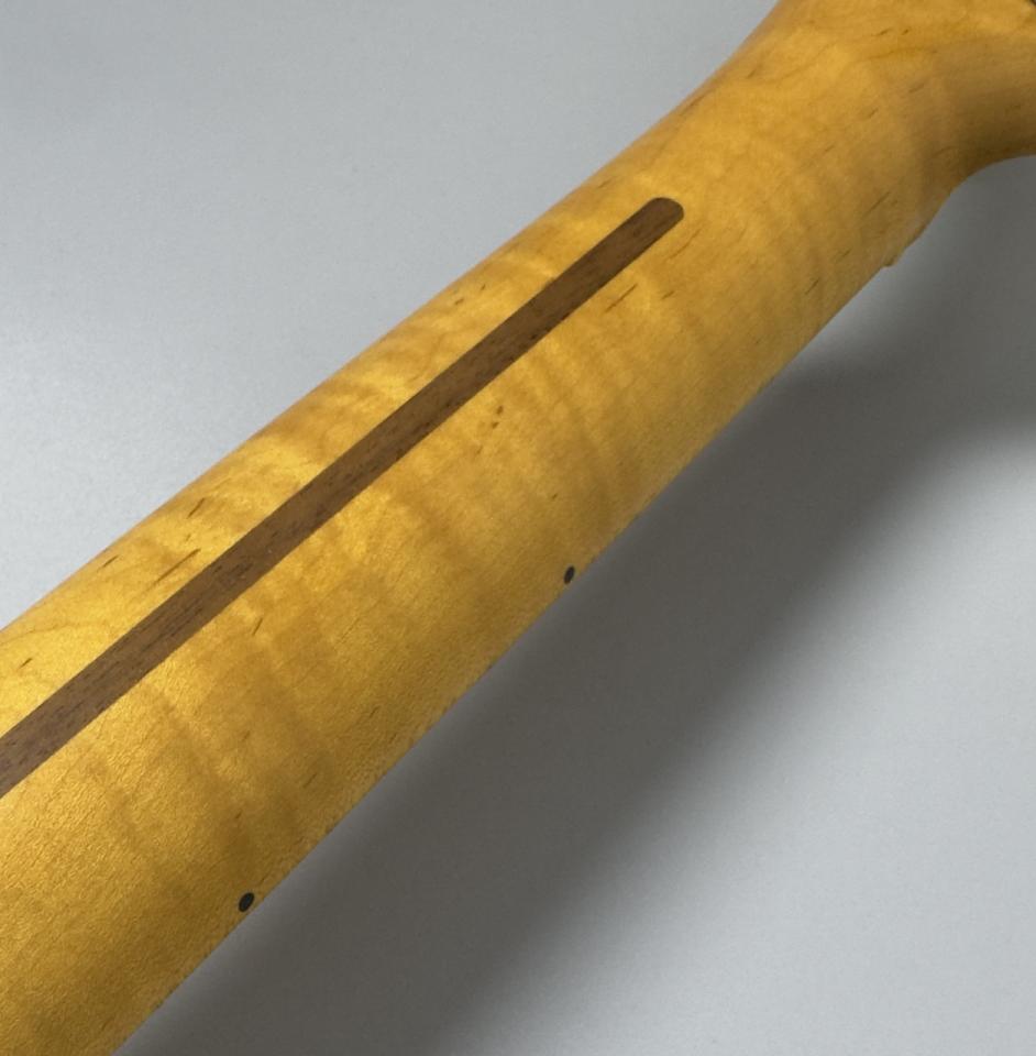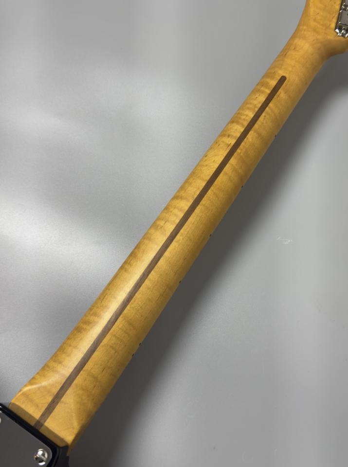 その一方で、ネックには厳選された3Aグレード・フレイムメイプルを採用。量産モデルではまず見られない立体的で深みのある杢目は、一本一本が明確な個性を持ち、所有する歓びを強く刺激します。1951年当時のUシェイプではなく、あえてCシェイプを採用することで、ヴィンテージルックスを保ちながらも、現代的な握りやすさと高い操作性を実現しました。