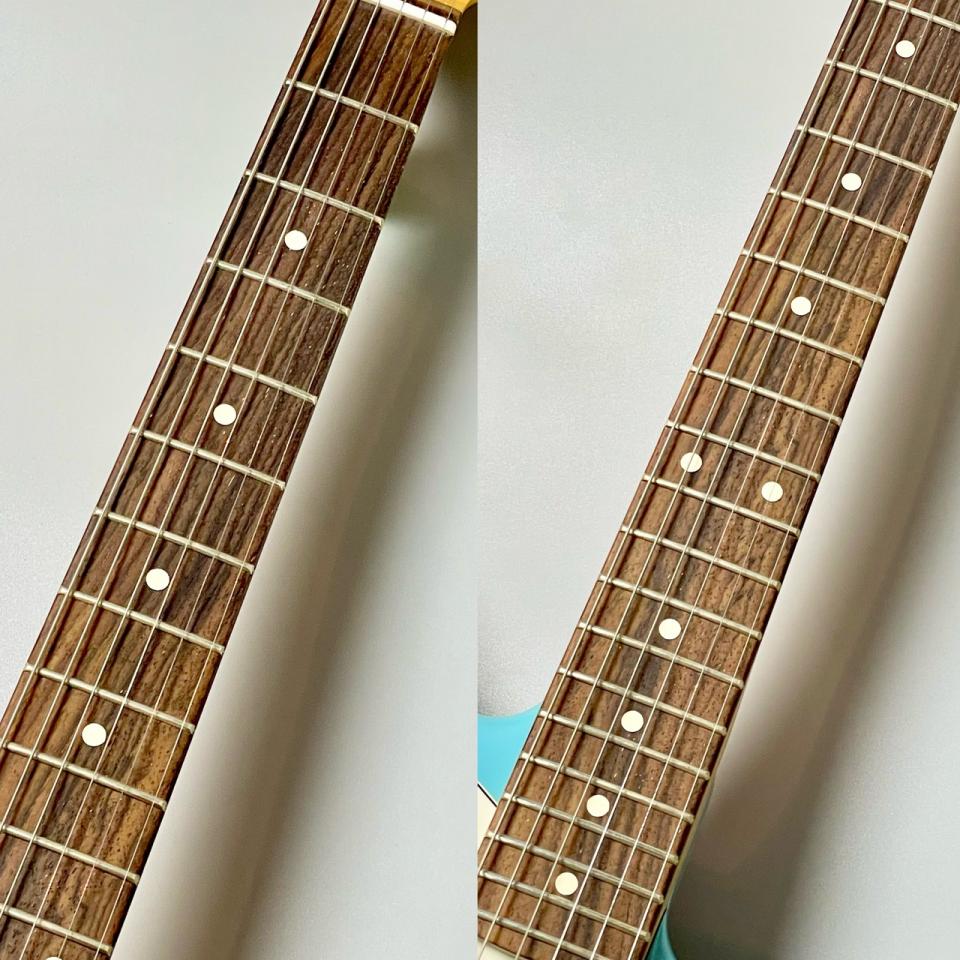指板のラジアスは9.5インチを採用。ヴィンテージの7.25インチよりもやや平らな指板面にすることにより、チョーキング時の音詰まりリスクを軽減しております。
