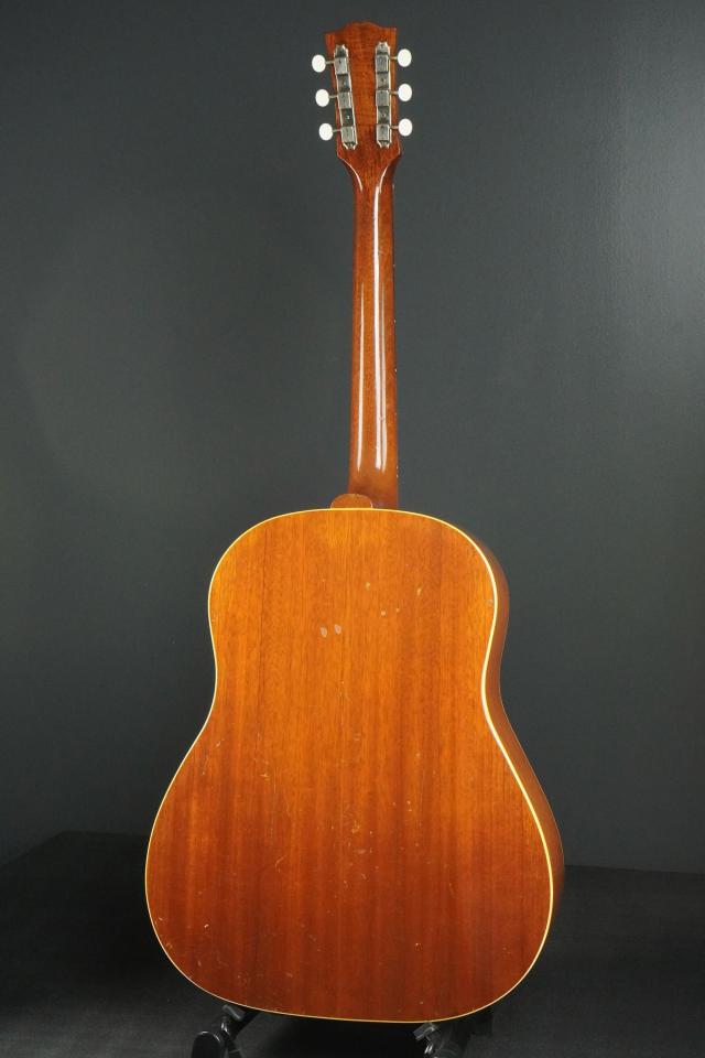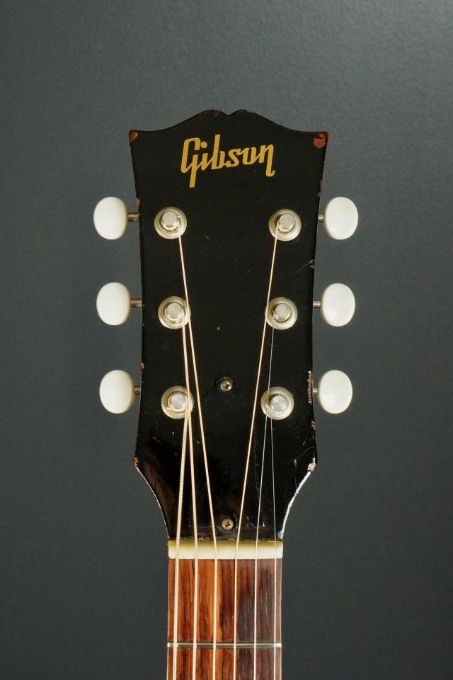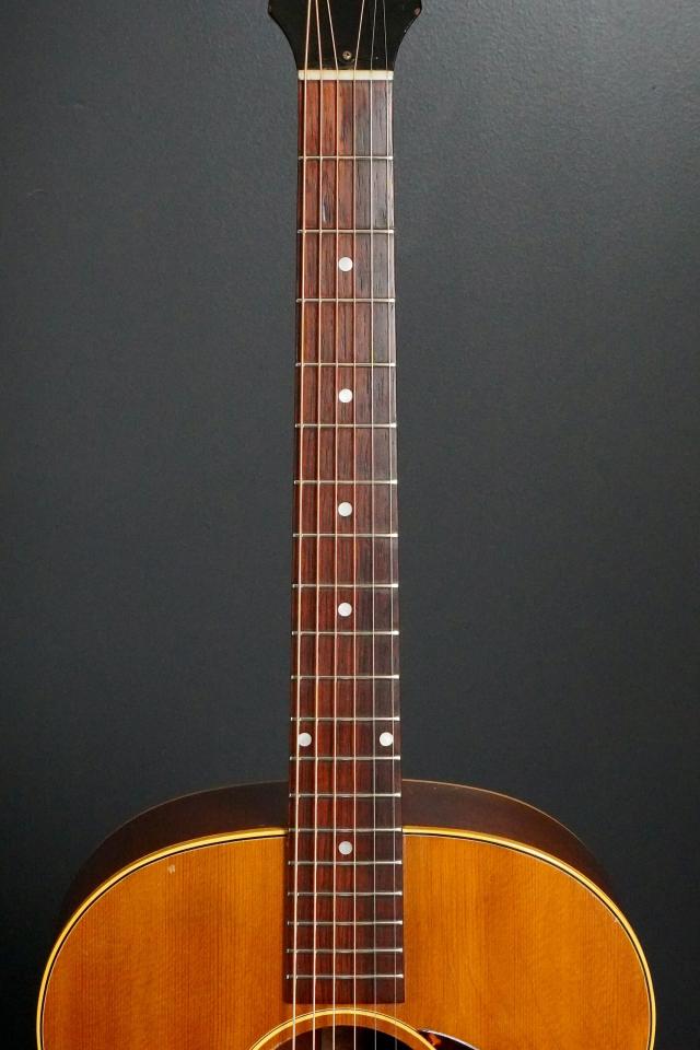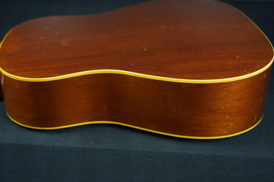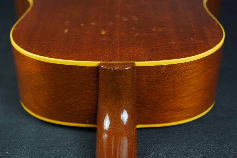 50年代前半のスモールガード期と、ピックガードが大型化された後期のラージガード期で、それぞれに人気がありますが、今回入荷はスモールガードでスキャロップブレーシングの1954年製J-50です。
