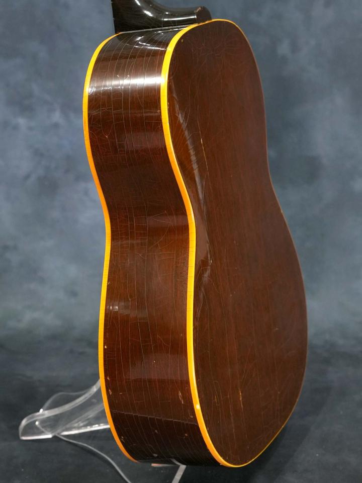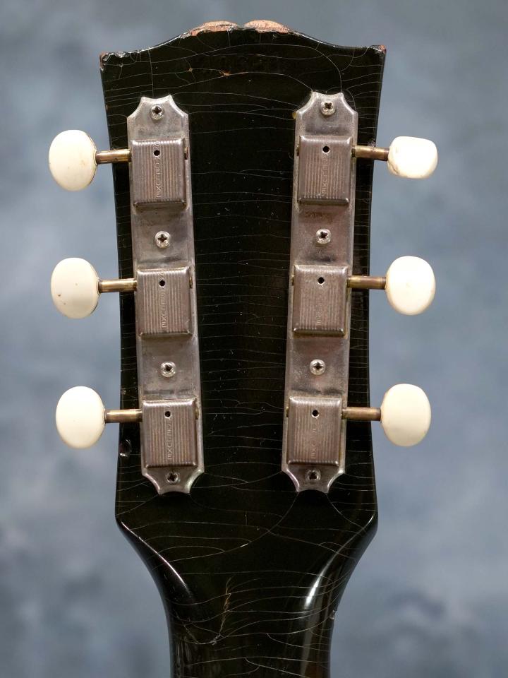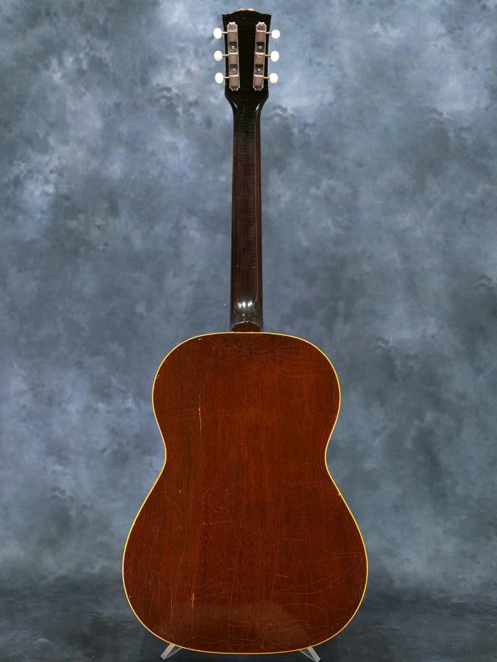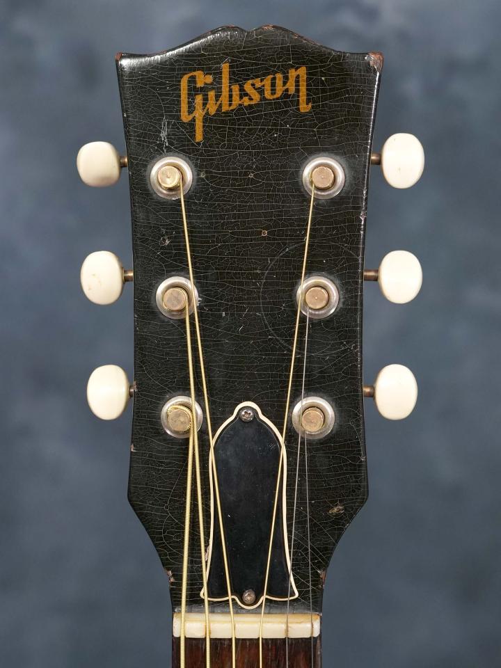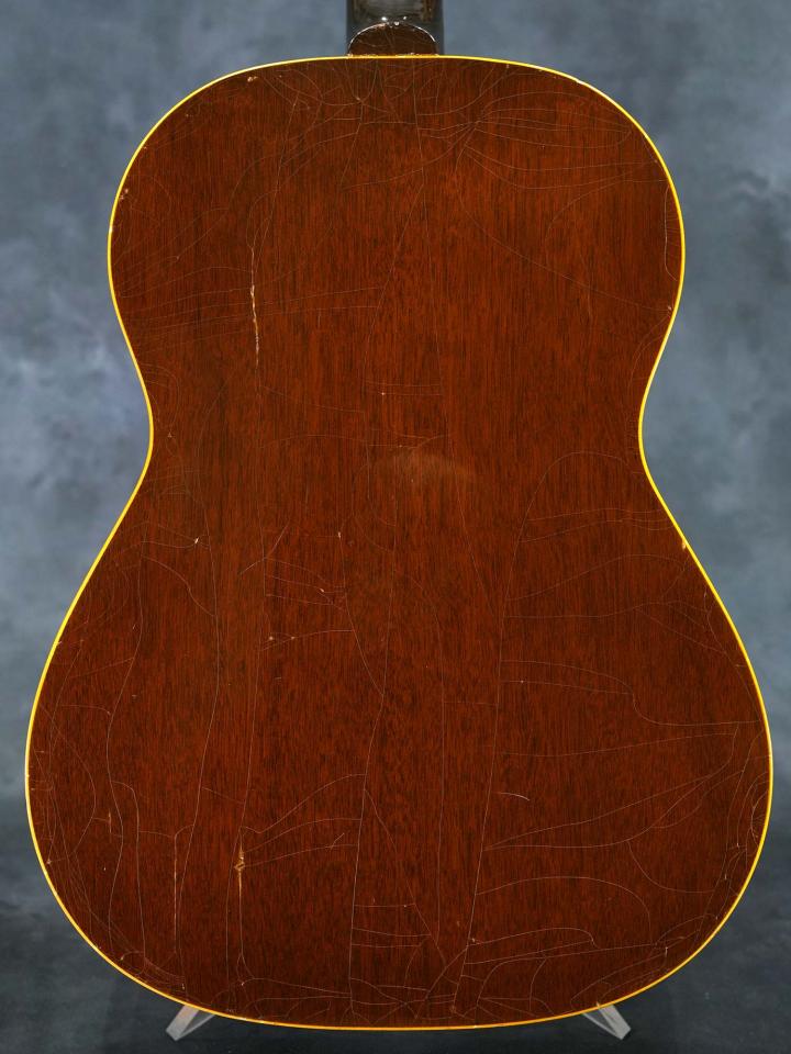 スプルースTop&マホガニーSide/Backの小ぶりなボディにラダーブレーシング、ナット幅43.6mmのマホガニーネック、ハカランダ指板、1961年までの仕様となるハカランダのレクタングルブリッジ、ラージピックガード、メッキされていないブラスポストの3連シングルラインクルーソンペグ、この年代のGibsonに稀に見られるシリアルナンバーが二重に刻印されておりますが、3もしくは4から始まる5桁の数字でどちらも1961年のシリアルナンバーです。