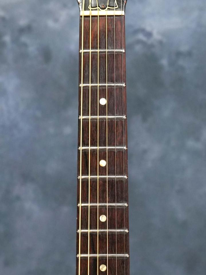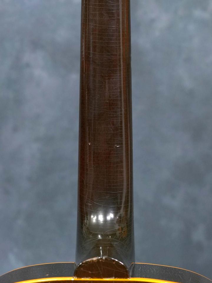 1弦側ヘッド付け根にネッククラックの跡が有り、ヘッド全体が取れたような割れではなく一部のヒビが接着補修されております。ネックからボディにかけて相当古い時代にオーバーラッカーされておりブリッジまでクリアが吹かれています。ピックガードのサウンドホール側にピックガードクラックとサウンドホール上の一弦側にクラックが有り、どちらも裏側から割れ止めを接着してしっかり補修されています。