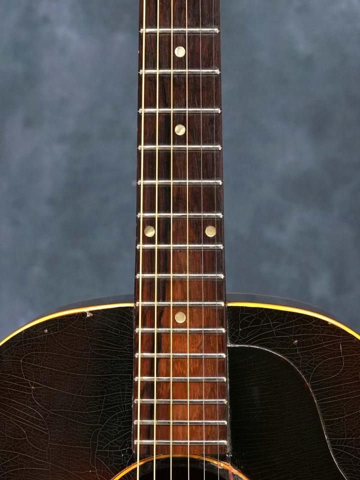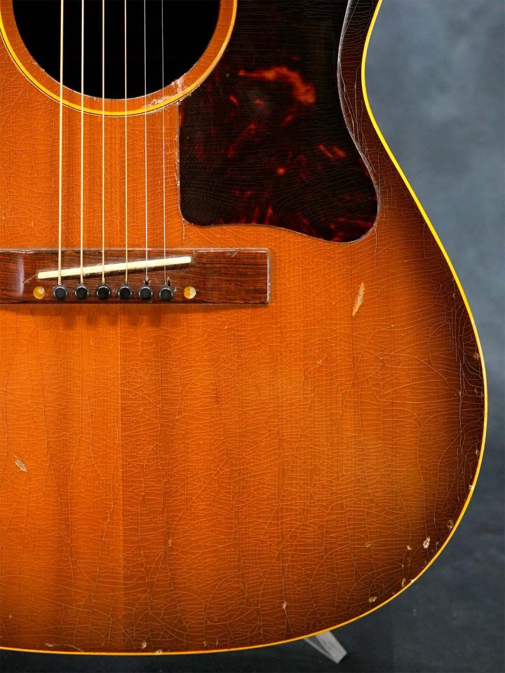 ヘッド~ネック~ボディに至るまで、オリジナルフィニッシュのウェザーチェックにオーバーラッカーのウェザーチェックが重なっており、クラックリペアに加えて使い込まれた事で塗装剥がれも多く、製造から60年以上が経過している事を物語る圧巻のルックス。ラダーブレイシングのLG-1ならではのポコポコとしたチープな響きと見た目通りにガランと枯れた大きな音色が心地よく、渋いルックスと枯れた音色のGibsonスモールボディをお探しの方にオススメの一本です。