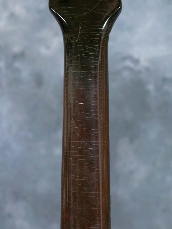 ネックはほぼストレートの丁度良い状態でトラスロッドの効きも良好、フレットは高音弦側のローポジションを中心に減っているものの、気になるようなビビりや音詰まりは無く演奏性は良好です。