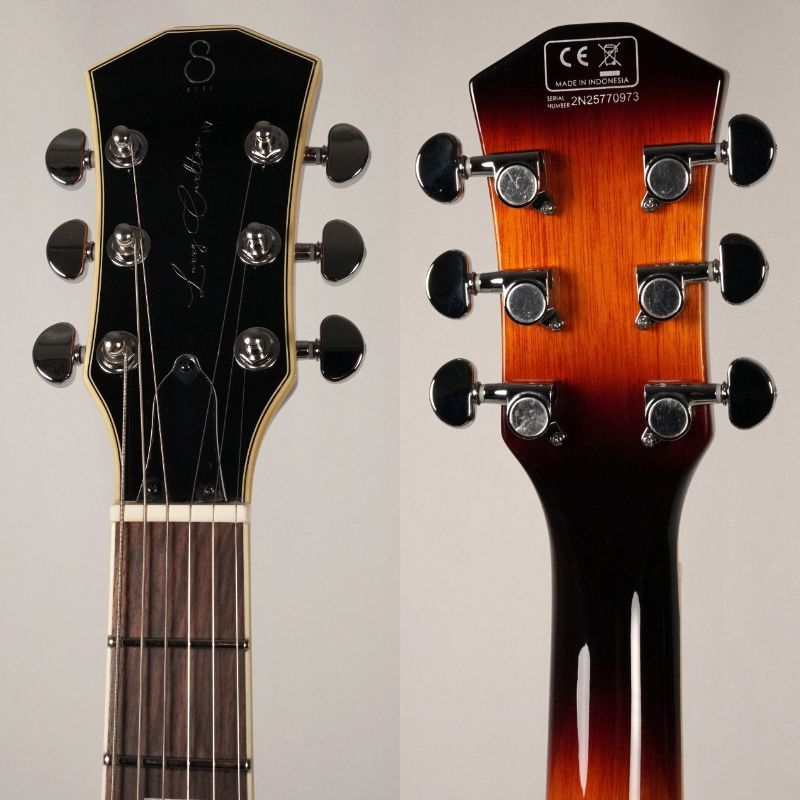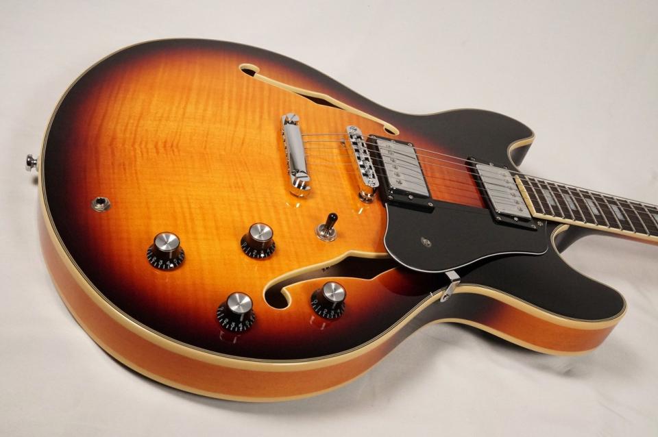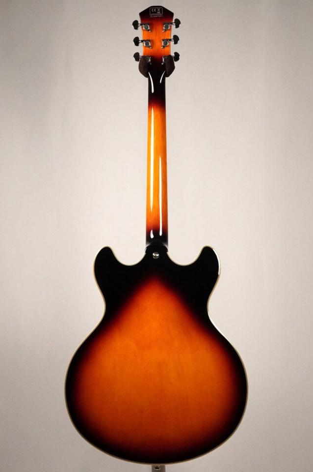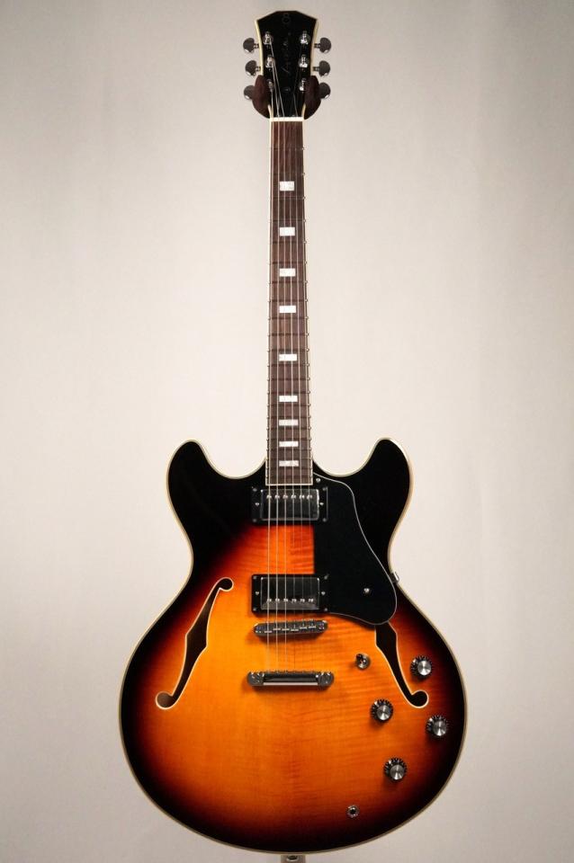 出音の印象といたしましては、本家ES335よりも若干タイトな鳴りを持ちつつも、その分ピッキングへの反応速度は速く、様々なエフェクターを通してのサウンドメイクを可能にしており、プレイヤーの表現の幅により広がりを与えてくれます。比較的お求めやすい価格帯ながら、このクオリティは見事といえます。また、ホロウギターならではの甘さのあるサウンドとサスティーンの長さを残しており、それでいてハウリングの少なさを実現したこちらのギターは、ジャズやロック、フュージョン等あらゆるジャンルに対応できます。