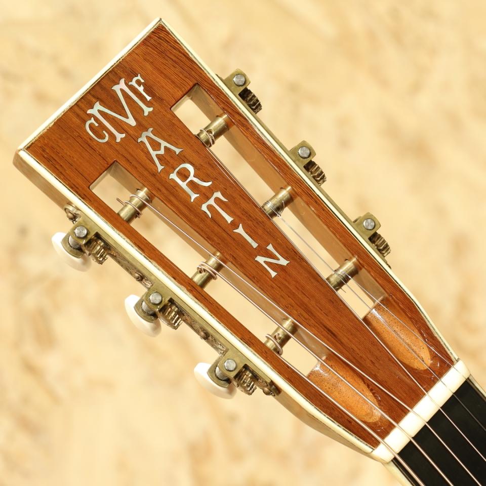 現マーチン工場の中でも、卓越した技術と豊富な経験から至極のギターを造り出す"Martin Custom Shop"。ここ数年一際話題を集めるオーセンティックシリーズの製作をはじめ、高い完成度を誇るこだわりのカスタムモデルを製造するトップクラスの部門です。本器は1919年製OO-42を再現すべく徹底的にカスタムされた”CTM 00-12F Style-42 Highly Figured Koa”。2014年製のUSED品です。ボディ全面に揺らめくフィギュア―ド杢の入ったプレミアムグレードのハワイアンコアを使用されています。ジェニュインマホガニーネック、スロテッドヘッド、44.5mmナット幅、ブラックエボニー指板&ピラミッドブリッジ、ロングサドル、スノウフレイク指板ポジション、ウェバリーゴールドペグ、バーチカルヘッドロゴ、エボニーロッド、アディロンダックスプルースを使用したスキャロップドXブレイシング。1919年頃はまだ鉄弦を張ることが少なく、ガット弦を張ることの多い時代。それ故にクラシックギターでよく見られるスロテッドヘッド、長方形のブリッジ、12Fジョイントの仕様となっていました。この時代のモノは音の立ち上がりが非常に早く、軽いタッチ感でも反応し、空気感を強く含んだ膨らみ感のある出音が特徴です。その時代のギターを再現すべく製作、ルックスはまさに当時のギターと遜色ありません。ネックシェイプは丸みを帯びたVシェイプ。当時の雰囲気を再現しつつも現代的に弾きやすいグリップとなっています。ハワイアンコアらしい艶やかさ、甘さを備えた音色。パシッと弾けるような響きと粒立ちの良さが格別です。12Fジョイントのギターで感じられるヘッドルームの広さ、余裕もありオープンに響くところも通な方には嬉しいところ。中域にも情報量が多く、解像度の高いサウンドを持っているため楽器の良さを前面に出しやすい印象です。その上で40番台らしい倍音感、華やかな響きと包み込むような出音。立ち上がり速度も速く、分離感も充分。とはいえ程よく纏まり、音色にも太さがある為プレイスタイルを問うことはありません。ですが1919年当時の楽器は指で弾かれていたことを考えると、やはりフィンガースタイルで楽しみたくなる1本でしょう。ブリッジ6弦側端に製造時の塗装切り欠きの際に僅か大きくカットされたであろう箇所、トップのセンターシーム上に若干の塗装の引けが見られますが、使用上全く問題はございません。アイボロイドバインディングである以上致し方ありませんが、経年によるバインディングの剥がれはくびれ4か所とヘッド表外周に見られますがキレイに修正されています。その他ボディトップ面に光にかざすと見える薄い当てキズが6弦側ショルダー箇所に1つ、ヘッド裏4弦ペグ付近に1つ、バインディングが縮み若干の隙間が出来ている箇所、サウンドホール1弦側の薄い擦れキズ、全体的に極々薄い擦れキズ等見られますが、使用感は少なくキレイな状態をキープされています。エボニーロッド故にチューニングすると僅か順反りとなりますが致し方なく、弦高は現状丁度良い高さに整えられサドルの残りも充分残された1本です。ここまでの拘りを詰め込まれたカスタム品、謂わばオーセンティッククラスに相当する程の再現度です。眺めて良し、弾いて良し、コア材特有の音色を楽しみながらゆったり弾くも良いでしょう。このクオリティ、是非ご体感下さいませ。