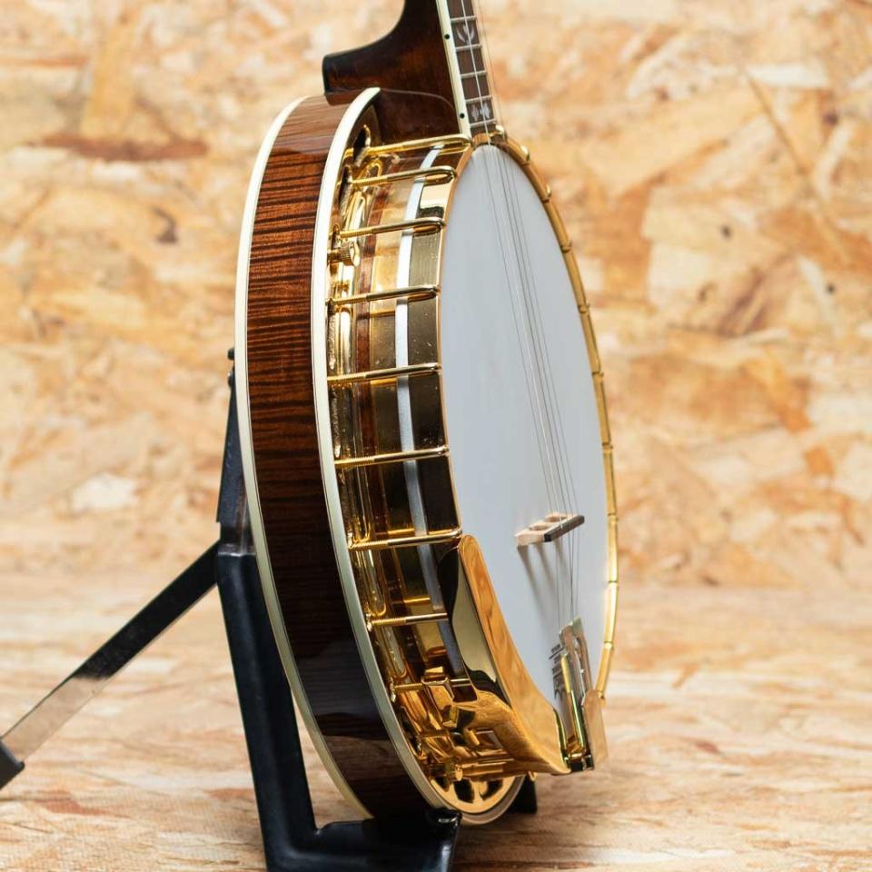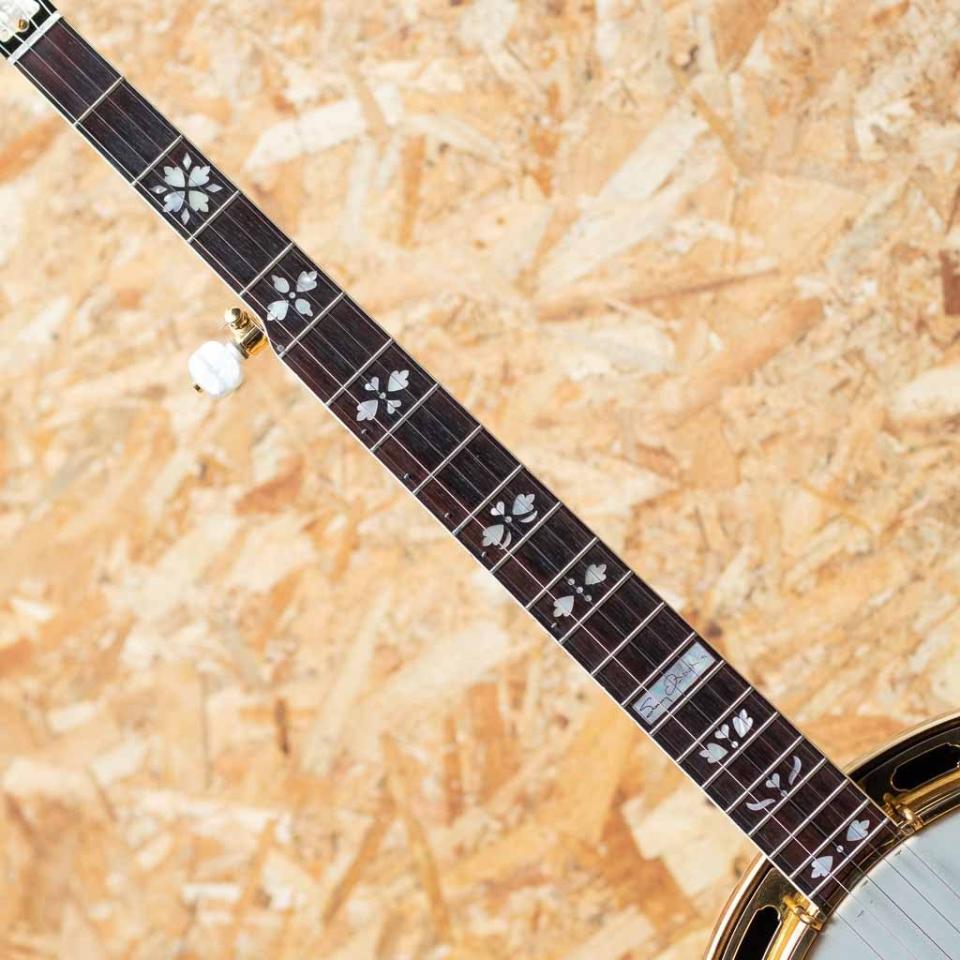 Osborne Chiefと呼ばれバンジョー通な方には知られる存在。ブルーグラス界のレジェンドSonny Osborneが監修・設計に深く関わった、プロフェッショナルな5弦バンジョーです。バンジョー界の最高峰ともいえる要素を結集し、ソニー・オズボーンのオリジナルGibson Granadaをインスパイアしたモデル。Osborne Chief モデルはコンバージョンネック製作で著名なフランクニート製のネック、Cox製のリゾネーターとリム、Blaylock製のトーンリングを採用し、ブルーグラス・バンジョーの理想形を、Sonny Osborne自身の耳で完成させた1本。メイプルネックはネック裏のサラっとした仕上がりのスピードネック仕様、ローズウッド指板にハーツアンドフラワーインレイ、15fにオズボーンのシグネイチャーインレイ、美しいフィギャード杢のメイプルリゾネーター、3plyメイプルリム、プレストテールピース、Blaylockフラットヘッドトーンリング、1ピースフランジ、デュアルコーディネーターロッド、ハードウエアーはゴールド、2.3弦ペグはゴールドキースチューナーを搭載。パールナット、パールトラスロッドカバー。5弦7.8.9.10.12fにスパイク打ちとフルリグ仕様。ゴールドパーツは年代なりの曇りくすみがございますが濃いゴールドを残しています。ネックコンディション良好、ローフレットに僅かに減りが見られますがビリつきもなく演奏に問題はありません。音量豊富で太く乾いたブルーグラストーンをもち、レスポンス感に優れ、華やかな響きが素晴らしいバンジョーです。セミハードケース付属(やや使用感あり)