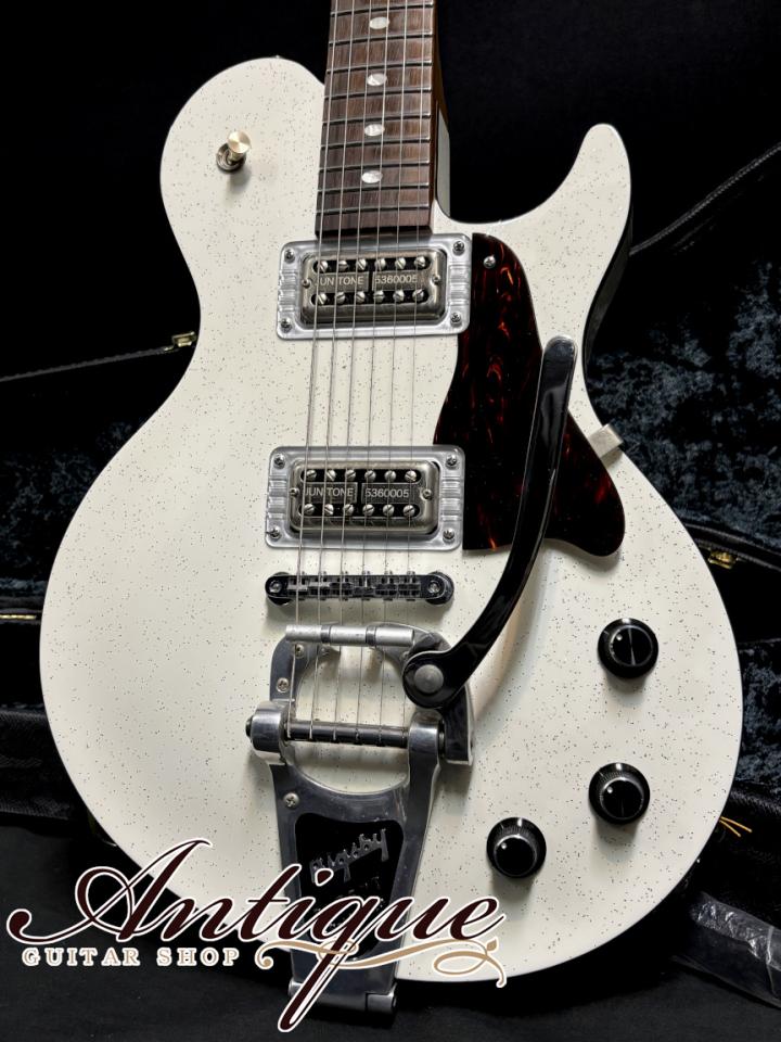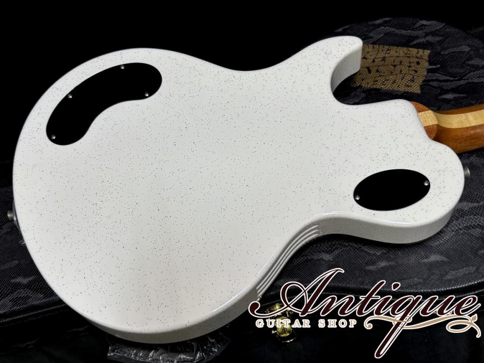 まずその拘り抜いたスペックとして、ベースとなるのはアーチドトップにトップ材と密着させない削り出しの特殊チェンバーセンターブロックを採用したセミホロウ構造のRRCHモデルとなりますが、採用された材からレギュラーモデルとは別格の内容。通常であればスプルーストップ&アルダーバックにマホガニーネック&エボニー仕様となりますが、こちらは全て厳選材にて、メイプルトップ&ホンジュラスマホガニーバックにネックには強度&サウンドを考慮し、フィギュアドメイプルをセンターに挟んだホンジュラスマホガニーネック&ハカランダ(ブラジリアンローズウッド)指板が採用されており、こちらは通常のオプション項目には無い特注のアップグレード内容となっております。またカラーも特注のカスタムカラーとなるスパークルホワイトにてボディ全体をフィニッシュ。更に加えてバインディングやピックガードもトートイズに、ヘッドはボディと合わせたマッチングヘッド仕様、HATA製セレクタースイッチ、ABR-1ブリッジにBigsbyを搭載した他には無拘りの激レアスペック。その他としては、RRシリーズお馴染みの25インチスケール、59レスポールに近い抜群のネックプロフィール、約42mmナット幅、WARMステンレスフレットの22F仕様、305R、オーバルホワイトシェル・ポジションマーク、Gotoh HAPチューナー等が挙げられます。