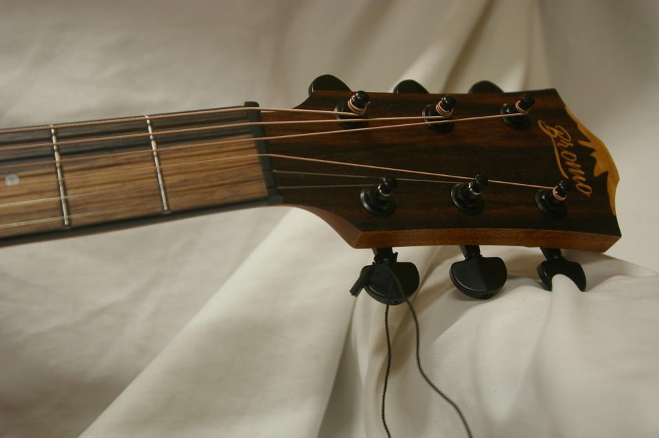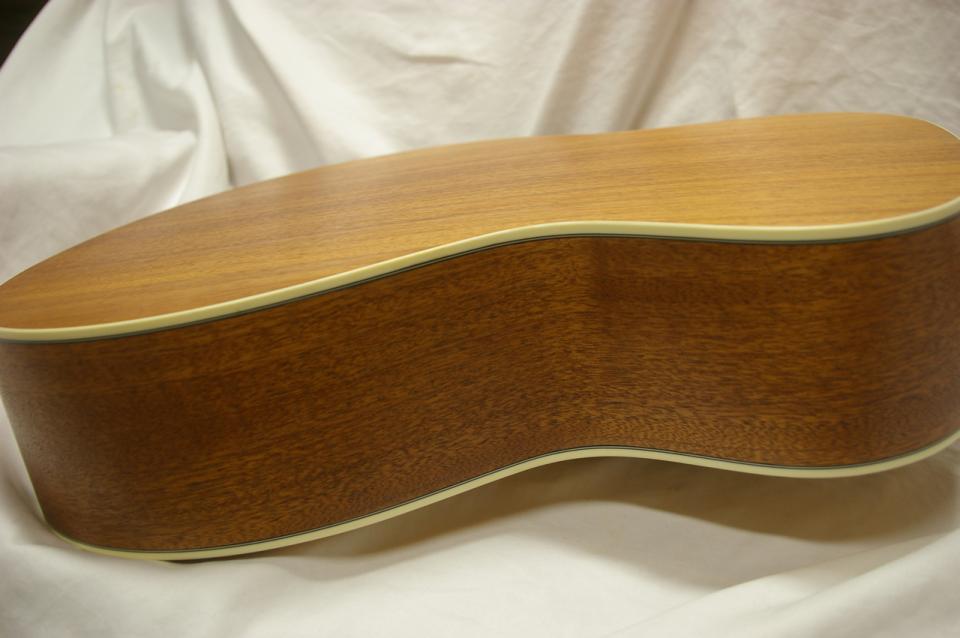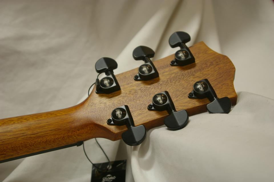 ふくよかな低音と歯切れの良いサウンドを奏でるオーディトリアムシェイプを採用し、深い低音と煌びやかな高音を奏でます。ボディバインディング、オリジナルデザインのイーグルウイングブリッジ、アマラエボニーを丁寧に組み合わせて制作された、ロープデザインのロゼッタが力強く上品な見た目を演出しています。