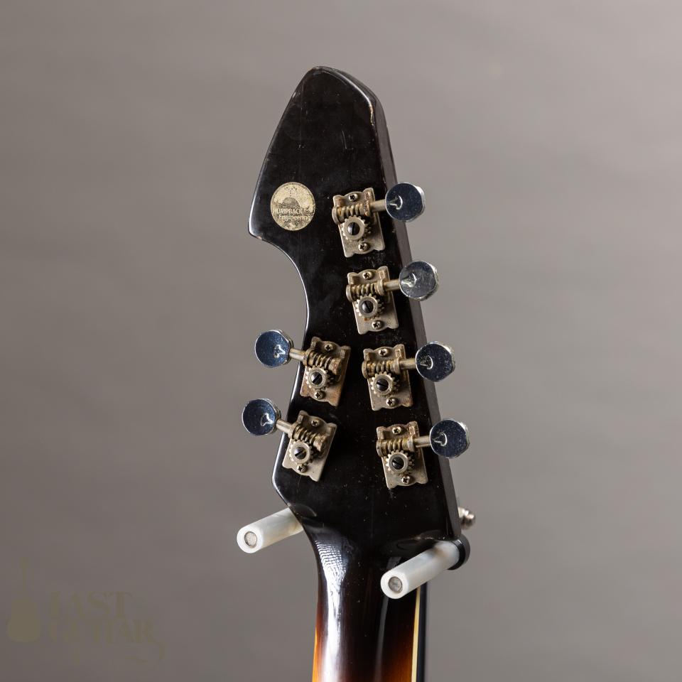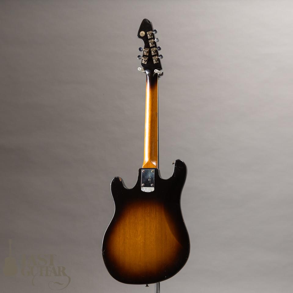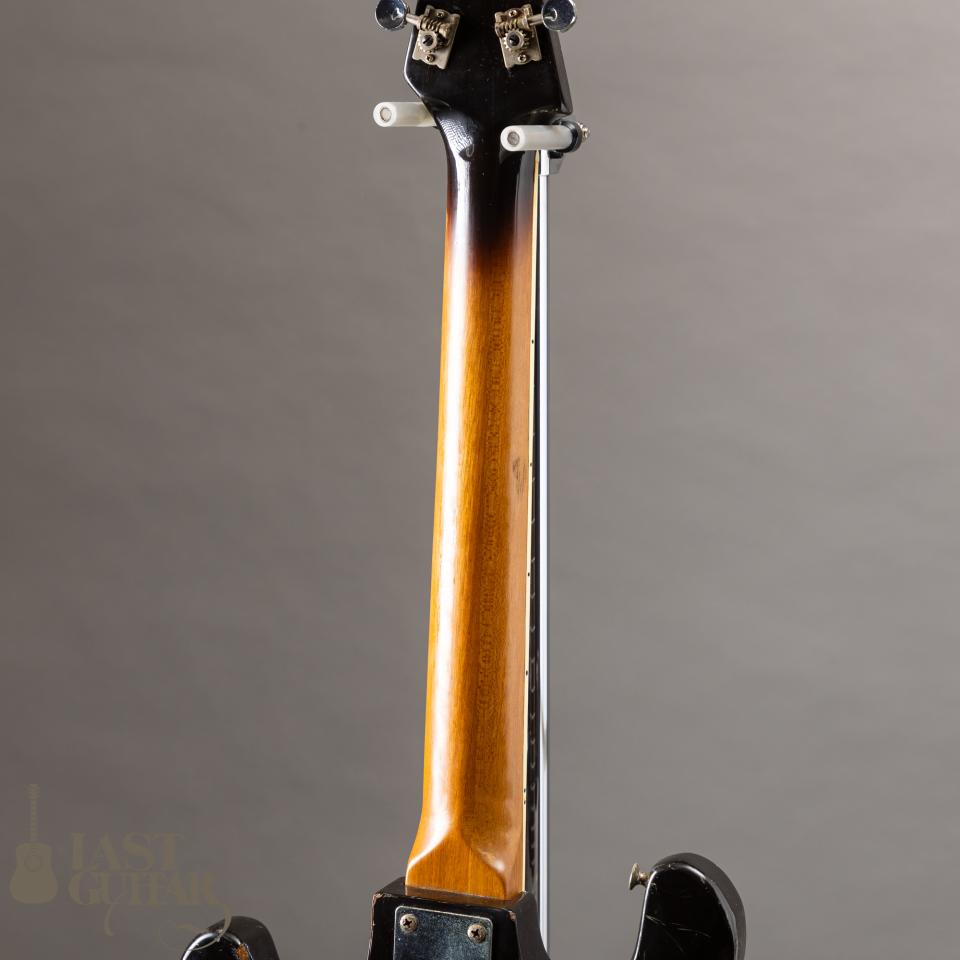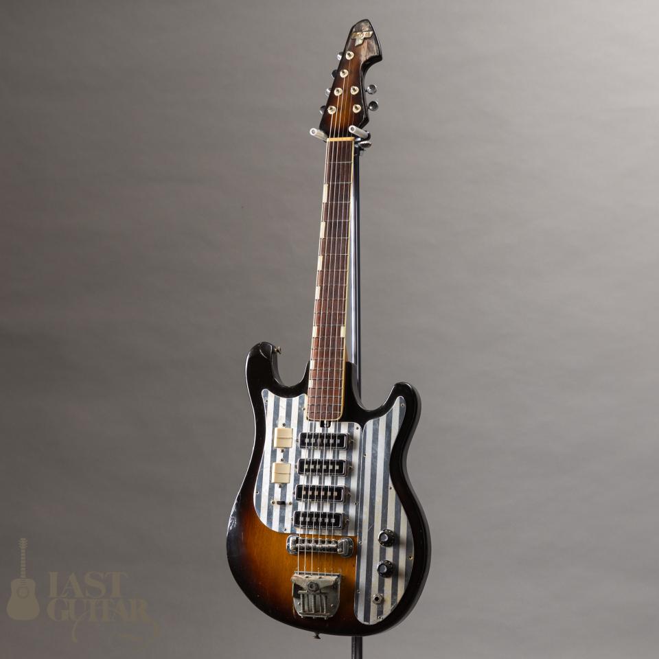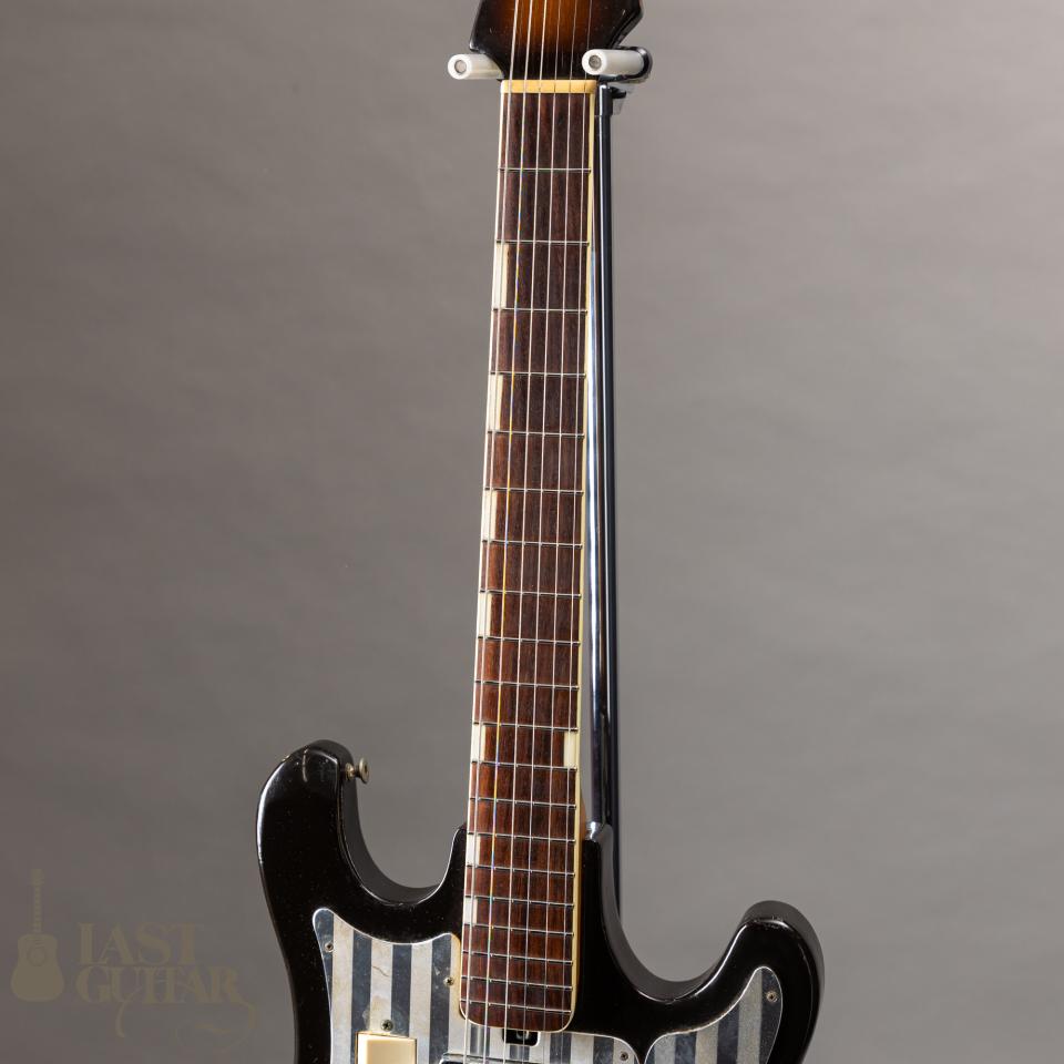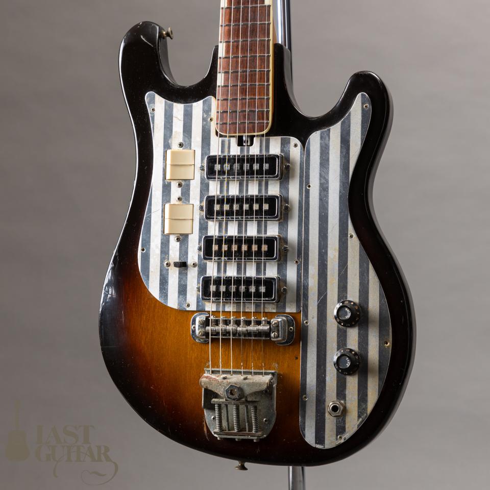 本機は、以前にそのカスタマイズが施された中古品です。母体は、1960年代のTeisco WG-4Lです。当時、PUの数の違いによりWG-2L、WG-3L、WG-4Lが生産されていましたがそのピックアップを4基搭載した最上位機種で存在感が凄いですね。ピックアップはテスコの歴史の中でも一番人気があり、質が高いとされるスクエア・ポール・ピースタイプのシングルコイルPUを搭載しており、他にはない太く色気のあるサウンドは見事です。また欠品していることが多いヘッドのロゴプレートも残っておりファンの方には嬉しいポイントではないでしょうか。ペグ配置4対2のテスコオリジナルヘッドシェイプやストライプのアルミニウム製ピックガード(ネジ3個欠品)もその時代を存分に感じることができますね。