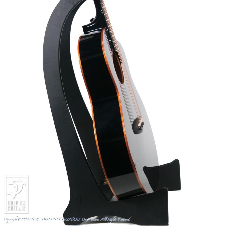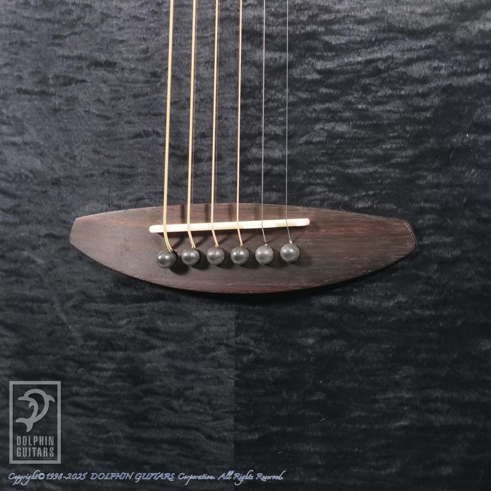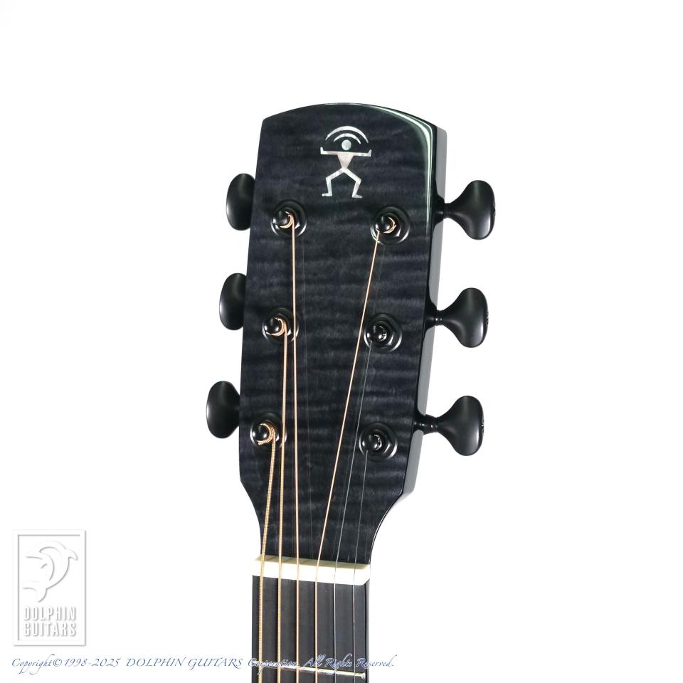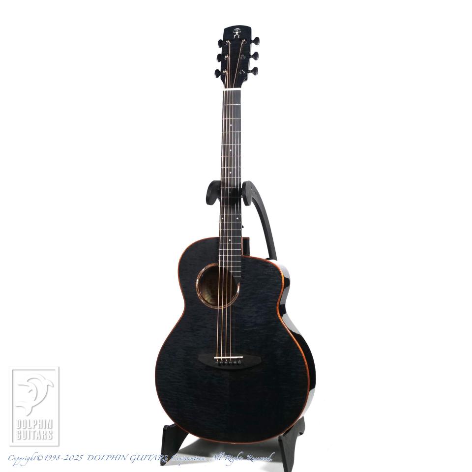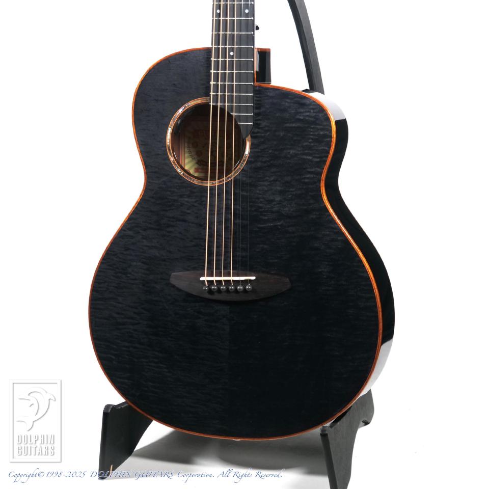 カーリーメイプルをセダー材の表面に配した美しいギター。シースルーブラック塗装により、杢目が浮かび上がるような幻想的な印象を与えます。サイド&バックはほのかにラメが輝く凝った仕様です。
