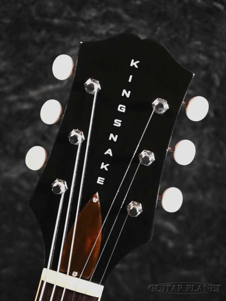 「フルアコ」と言うとジャズを連想がちですが、そもそもソリッドギターが登場する前は、カントリー、ブルース、R&R、大衆音楽など全てフルアコにて奏でられていました。当時のサウンドと言えば、アンプも黎明期であり、小型のチューブアンプのヴォリュームを上げた、ズ太いドライブサウンドです。その時代のワイルドさも「フルアコ」と言うギターの魅力であると言う事を伝えるべく立ち上がったブランド、それがKING SNAKE(キングスネーク)です。