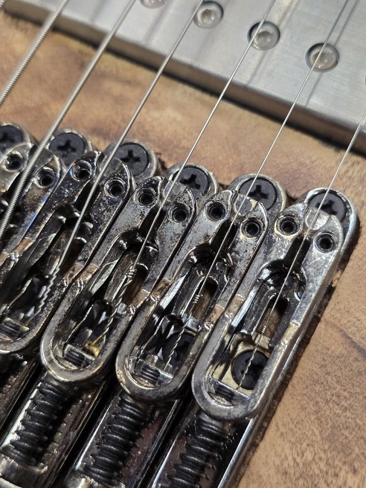 イントネーションの調整幅が広く、1音下げチューニングやそれ以上のダウンチューニングも容易に設定できます。弦高の調整も容易です。サドルを構成している部品数を極力少なくし、ギター本体の鳴りが生きるナチュラルなサウンドを実現しています。