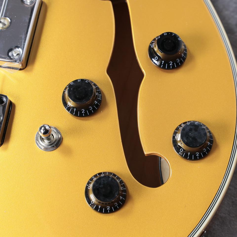 セミホロー構造のボディーは、メイプル材のボディートップ及びサイド・バックを採用。
