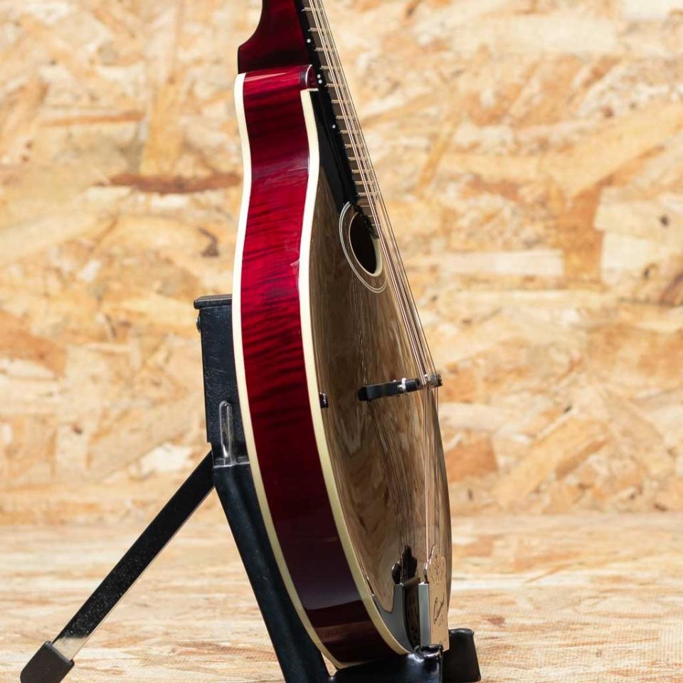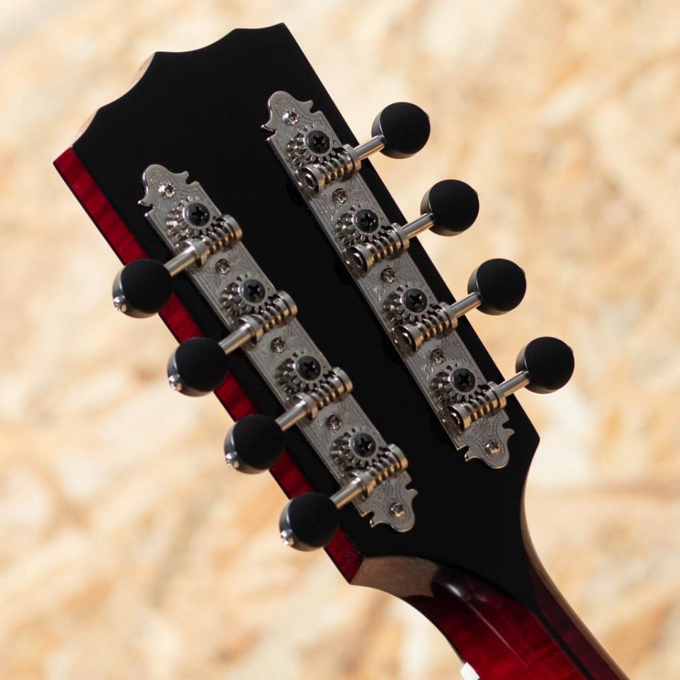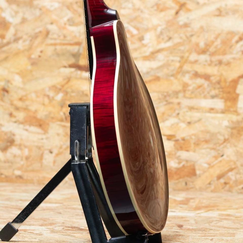 いくつかのメーカーで楽器製作を学び、その後North Field Mandolin立ち上げから製作に関わった後に独立する中国のMaster Luthier Qin Ji Duoが製作するQuint Mandolin。QT-A4 Black top。12FジョイントのオーバルホールStyle-A。パドルスタイルのヘッドにGotohペグ、Quint オリジナルテールピース。トラディショナルデザインをもちながらもラディアス指板にミディアムサイズのフレット、指板エンドのスクープ加工、アジャスタブルブリッジと現代的なアレンジを取り込み、レトロルックながら弾きやすさ、使いやすさを追求したモデルに仕上がっています。削りだしイタリアンスプルーストップ、削りだしフィギャードスイスメイプルバック、スイスメイプルネック、プレミアムエボニー指板、アイボロイドバインディング、極薄のニトロセルロースラッカーフィニッシュです。ナット幅30mmで握りごたえのあるネックに12Fジョイントならではの芳醇で深くコクのある響きをもちながら、パワフルで抜群の音量感を誇り、メローになりがちなワウンド弦でもしっかりとエッジの効いた鳴りを聞かせてくれます。ブラックトップにオーバルホールは精悍な顔つきとオールドな雰囲気を併せ持つグッドルッキンな仕上がり。トラディショナルな良さと現代的な元気のある鳴りを融合したかの様な響きを感じていただけるでしょう。アイリッシュやフォークなど多様なジャンルで使えるフラットマンドリンです。是非お試し下さい。ヘッドとボディートップに小キズが見られる為¥231,000を特価販売致します。Fiber Case付属
