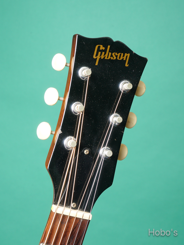 本ギターはラウンドショルダーモデルとしては後期のモデル(69年後半よりスクエアショルダーに変更)で、コンディション良好な逸品です。インパクトのあるGIBSON ロゴ入りのプラスティック製の厚型ラージピックガードや貴重なハカランダ指板とブリッジ、及びナローネックと呼ばれる細めのU字ネック仕様が採用されている点が特徴となっております。掻き鳴らして弾くとワイルドで乾いた音色で、コードサウンドのまとまりと歯切れの良い出音が秀逸。製作から50年以上の長い歳月を経過し、かつ弾き込まれて熟れたボディーからなる音色は、ウッド感に満ちあふれたまさにアメリカン・ヴィンテージ・サウンド。音抜けの良い鳴りの良い個体に仕上がっております。オリジナル性高く鳴りの良い個体をお探しの方には特におすすめで、マーティンギターと対極をなす他には無い格別の響きを存分にご堪能して頂けることでしょう。