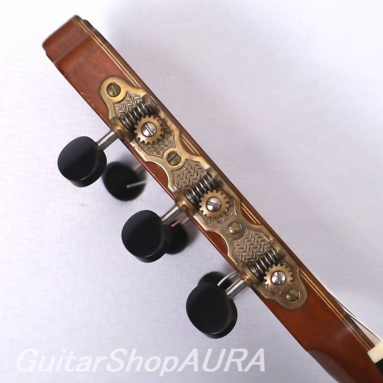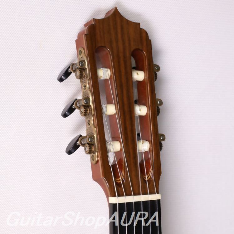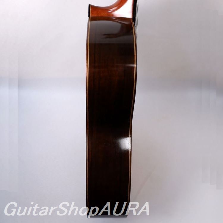 佐久間悟 製作のロマニリョスモデル 2012年製 No.39 Usedです。氏のブーシェモデルと並んで現在もカタログにラインナップされている代表モデルの一つ。その名の通りスペインの名工ホセ・ルイス・ロマニリョス(1932~2022)のギターに準拠したモデルで、その外観的特徴とされるヘッドシェイプを採用し、内部構造もロマニリョスオリジナルの設計によるものとなっています。ただしあの有名なロゼッタ(コルドバのモスク柱廊をモチーフとしたデザイン)は本器では佐久間氏オリジナルのデザインに変えられています。