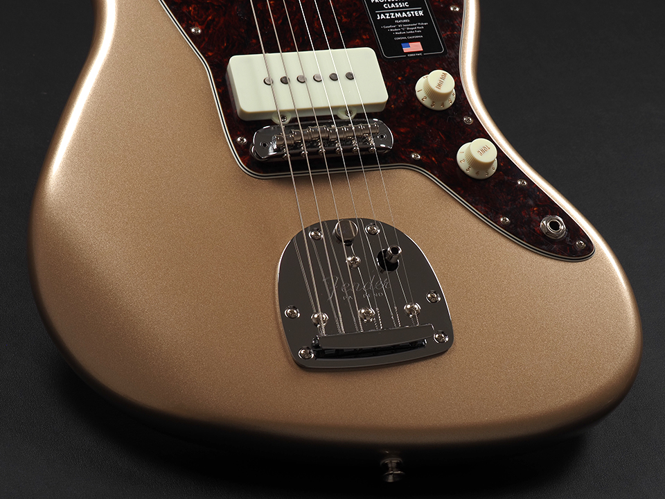 ルックス面でも、ヴィンテージ・ジャズマスターを想起させる上品なFaded Firemist Goldフィニッシュと4プライのブラウンシェル・ピックガードが絶妙なコントラストを描き、ステージでも圧倒的な存在感を放ちます。