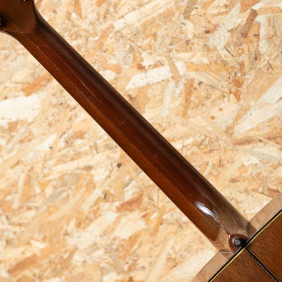 ジョン・レノンとジョージ・ハリスンがお揃いで入手したギター、ビートルズギアとしてあまりにも有名な機種である"J-160E"。1951年にアンサンブルの中でも音量で負けない様にと発表された世界で始めてピックアップが搭載されたフラットトップ"CF-100"。その基本コンセプトを受け継いだ"J-160E"は1954年に発表されました。本器は1973-75年製の1本。69年以降に採用されたスクエアショルダーボディー、チェリーサンバーストカラー、スプルーストップ、マホガニーサイド&バック、3pマホガニーネック、ローズウッド指板&ダウンベリーブリッジ、スロットインサドル、クラウンヘッドインレイ、パーロイドディッシュ指板インレイ、オリジナルブラック塗り込みスモールピックガード、ブラックバインディング。ダブルエックスプレイシング、15fジョイント、1ボリューム、1トーン、P-90、ナット幅約43mm、ネックヒールピン打ち有り、ペグは現行クルーソンのエイジングタイプに交換されています。ノーリン期のギブソンにはそれ以前とは異なるハードなブレーシングになり、以前の様な柔らかな鳴りから変化し、グっと市場価格はリーズナブルになります。しかしながらこの時期のギブソンがもつ鳴りはストロークで鳴らすとエッジの立った力強い鳴りでしっかりと受け止めてくれ、柔らかな鳴りとは異なる男臭いソリッドな鳴りが楽しめます。多くのロックアーティスト達がこの時期のギブソンを愛用してきた事もあり、探してる方もいらっしゃるのではないでしょうか。トップには薄いクラックがありますがこちらはしっかりリペアー済。現状フレットの残りは少なめです。ラッカーチェックは比較的少なめですが年代なりの弾きキズなどの使用感はあり貫禄ある佇まい。そもそもこのモデルは生で鳴らすスタンスのギターではないのですが、生音も独特のドライでザクザクとしたなキレの良いサウンドを味わって頂けます。その他詳細はお問い合わせ下さい。ギグバッグ付属です。