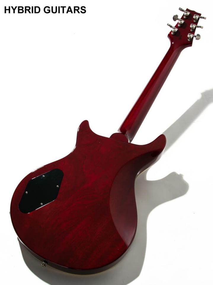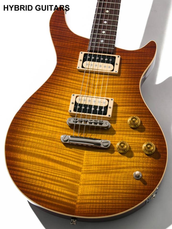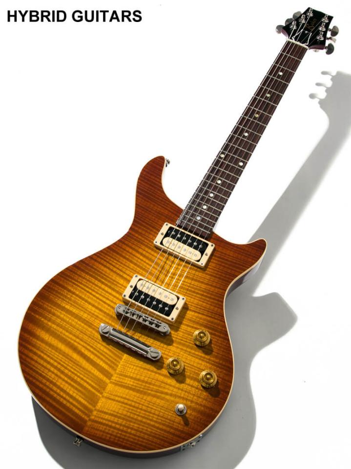 ボディトップには美しい4A Flame Maple、ボディバック・ネックにMahogany、指板にRosewoodを使用しており、Gibson Les Paulと同じウッドマテリアルです。本機はチェンバード加工がされておりふくよかな鳴りが特徴的で、ネックとボディの重量バランスの良い個体です。