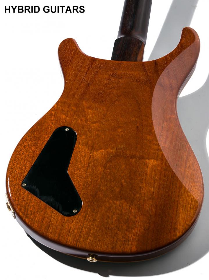 本機のトップ材は内側と外側で色調の異なるメイプル材が採用されており、内側の色が濃い部分には木の芯材であるハートウッド、 外側の色が薄い部分は木の辺材であるサップウッドを使用しています。ルックスはもちろんですが、この木材ならではのサウンドを持っており、音の立ち上がりの安定感、密度の濃い鳴り、気持ちの良いサスティーンが得られます。ボディトップにFigured Maple、バックにMahogany、指板とネックにBrazilian Rosewoodを使用しています。ピックアップにはModern Eagleの為に製作されたPRS Modern Eagle RP Setを搭載しています。