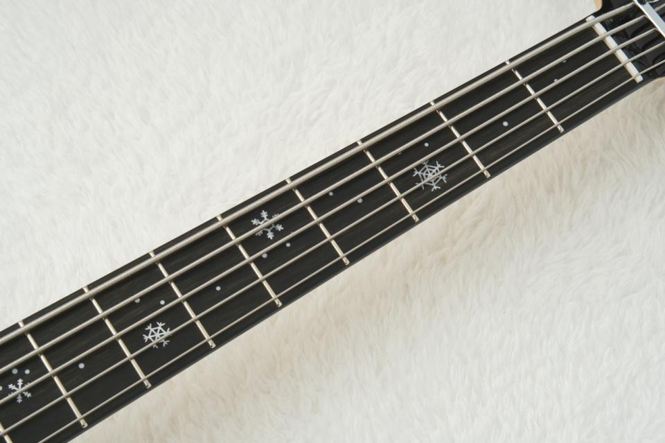 低音弦の輪郭をぼやけさせず、タイトな発音を支えます。 指板上には「桜隠し」のテーマ通り、桜の枝に雪が静かに降り積もる様子を描いたインレイワークが施され、儚くも美しい日本の情景を演出しています。