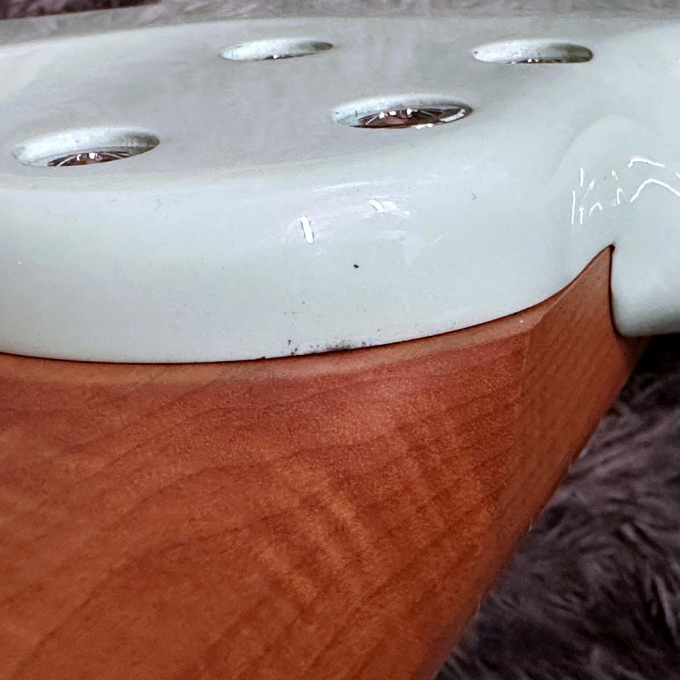 ローステッドメイプルとはメイプルを高温で加熱処理して材の中の水分や油分を揮発させることにより木材を経年変化した状態に人工的に近づけた材のことです。経年変化が進んだ材は歪みやねじれが生じにくくなります。ネックに使用されるとその効果は安定性だけでなくサウンドにも及び、豊かな生鳴りと経年変化したビンテージのようなこなれたトーンを生み出します。一般的に高級機種などで用いられる材ですが、手に取りやすい価格帯に落とし込むことに成功しました。