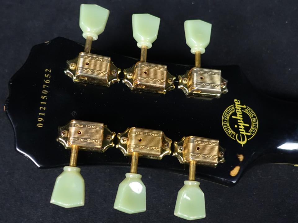 レスポールカスタム等と同様、ヘッドに施されたスプリットダイヤモンドインレイをはじめ、マルチバインディング、ゴールドハードウェアの採用、クルーソンスタイルペグ、オリジナルダブルカッタウェイシェイプボディ等、拘りが詰め込まれた1本に仕上がっております。