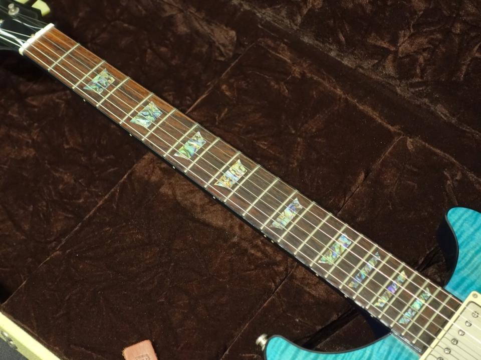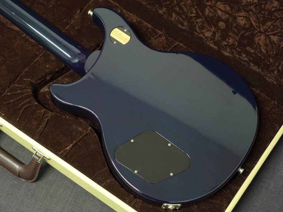 美しいフレイムメイプルトップ&マホガニーバックのダブルカッタウェイボディにマホガニーネック、ローズウッドフィンガーボードをセットしたウッドマテリアル。指板には美しいアヴァロンインレイが施されています。ピックアップはカバードのLollar Imperial Standardに交換が施され、コンデンサーはオリジナルのものから -鵺- NUE DEVICEのROSSOにアップグレードされております。